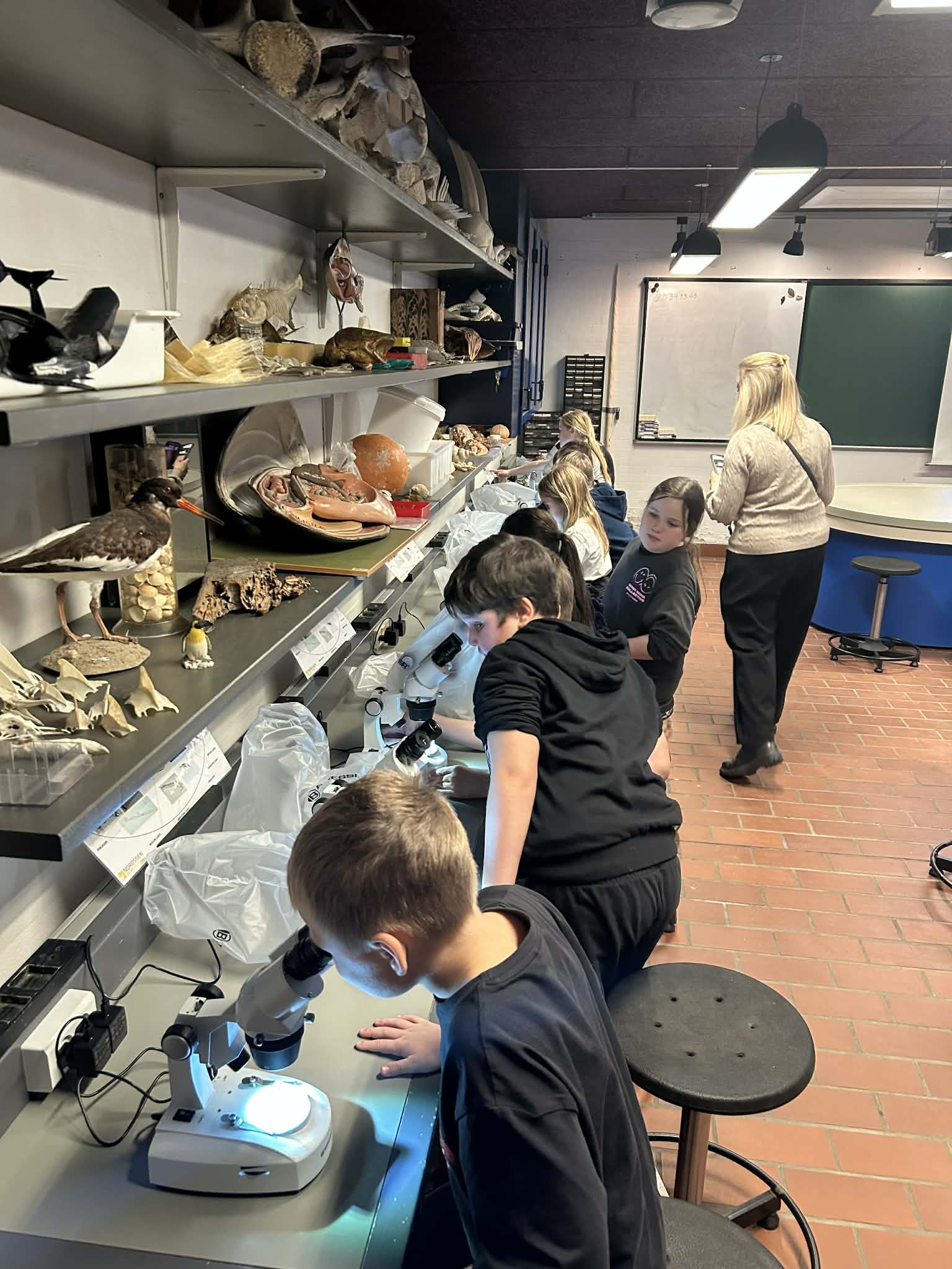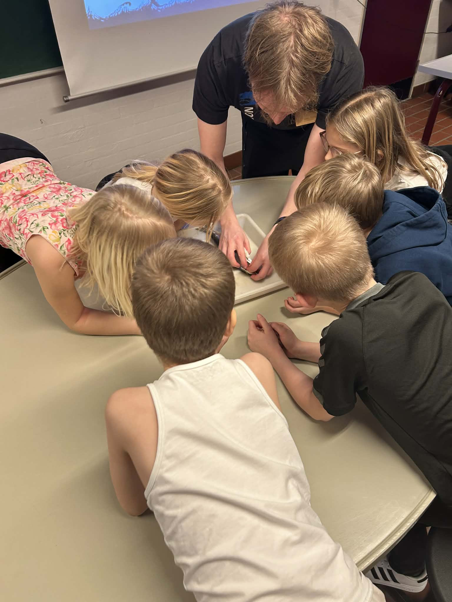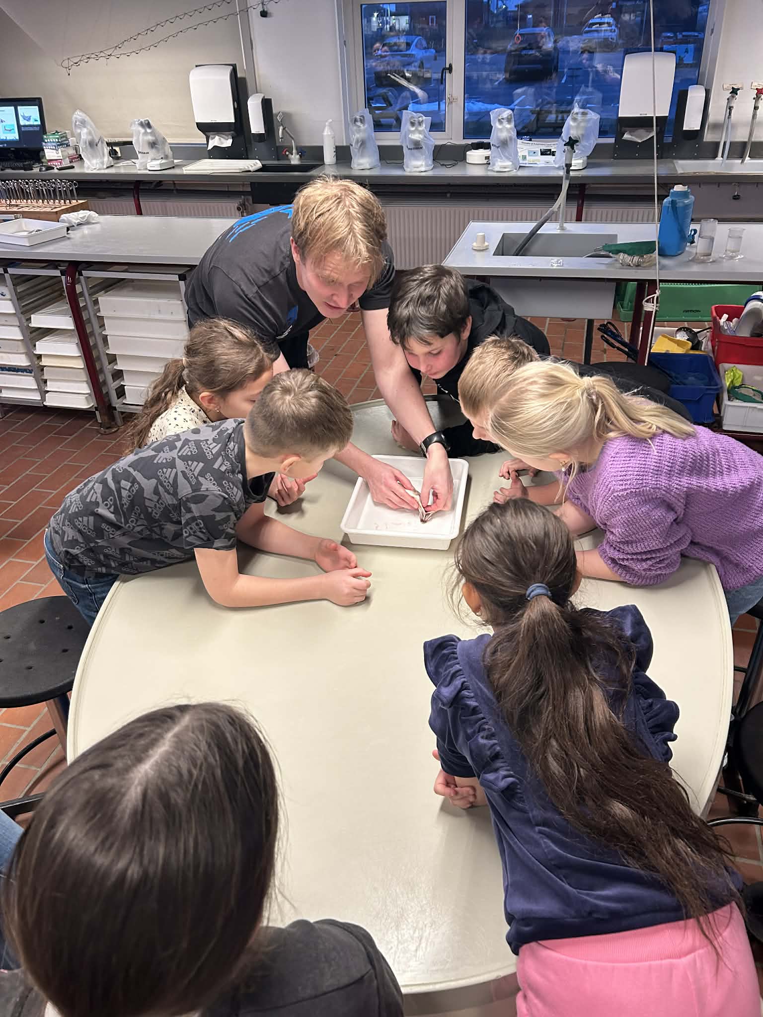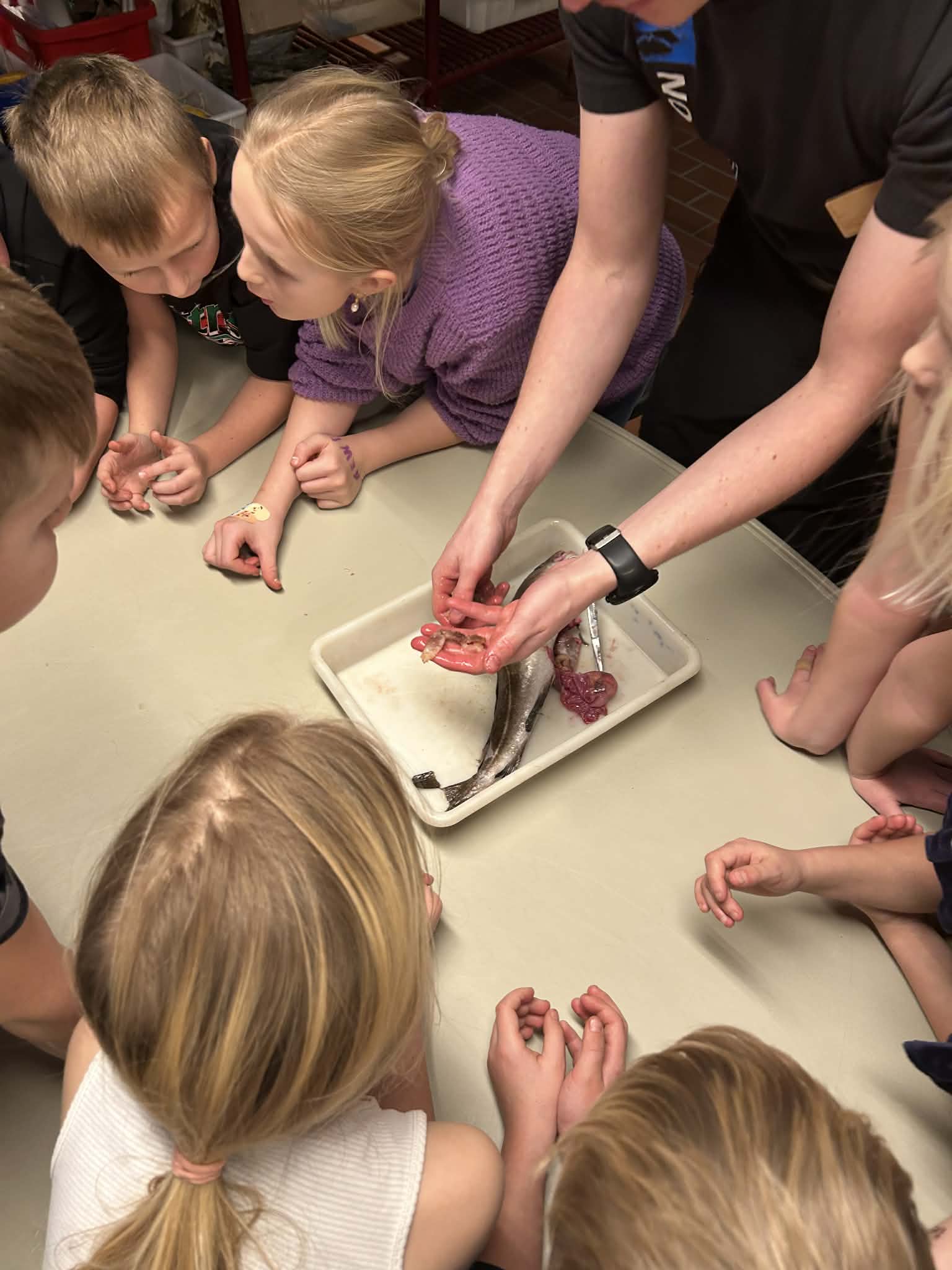 Vores guide Søren gjorde oplevelsen endnu mere spændende. Han viste os blandet andet, hvordan en sild ser ud indeni, og forklarede hvordan dens organer fungerer. Det blev dog ekstra interessant, da han også viste os en torsk, som havde noget helt særligt i mavesækken nemlig en krabbe. Det var både lidt ulækkert og virkeligt spændende på samme tid, og det satte gang i mange spørgsmål og grin i gruppen. Det var tydeligt, at fisk ikke bare er ”fisk”, men dyr med et ret vildt liv.