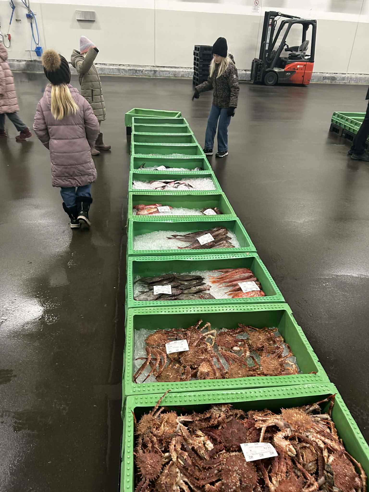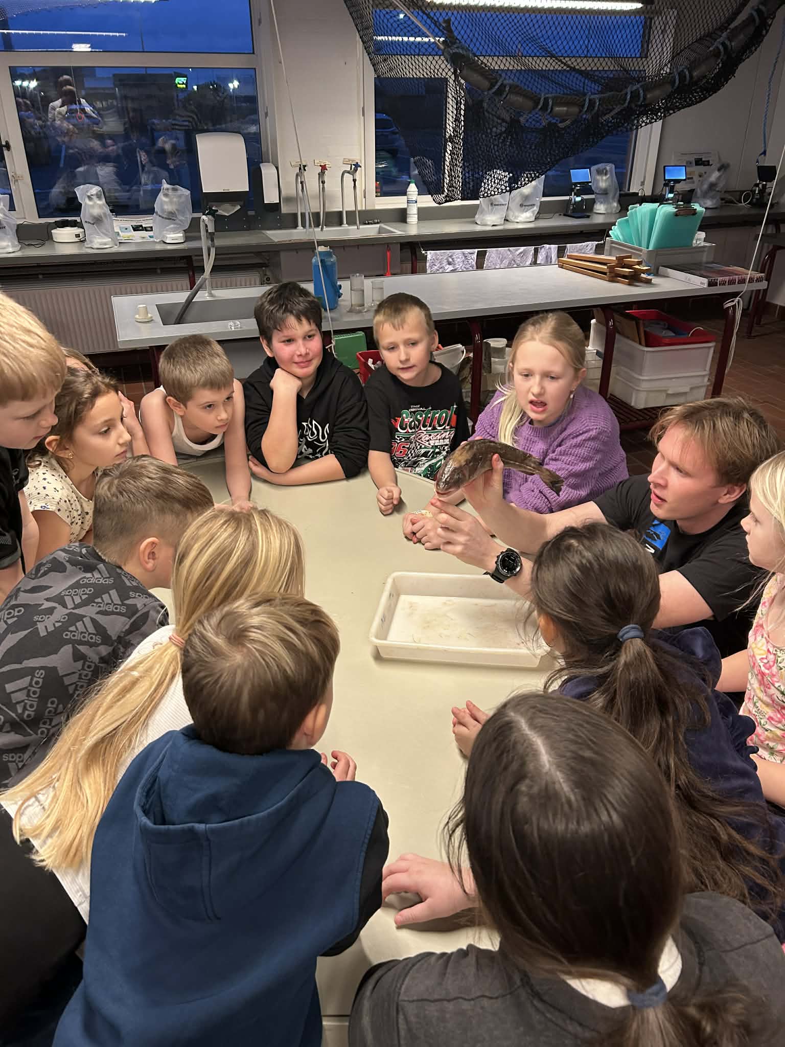 Næste morgen stod vi tidligt op for at tage til Hirtshals fiskeauktion. Her fik vi et indblik i, hvordan fiskeri og salg af fisk foregår i virkeligheden. Det var spændende at se, hvor hurtigt det gik, og hvor mange forskellige fisk der blev handlet. Efter at have set fisk både i akvarium, indeni og nu også på auktion, gav det hele pludselig rigtig god mening.