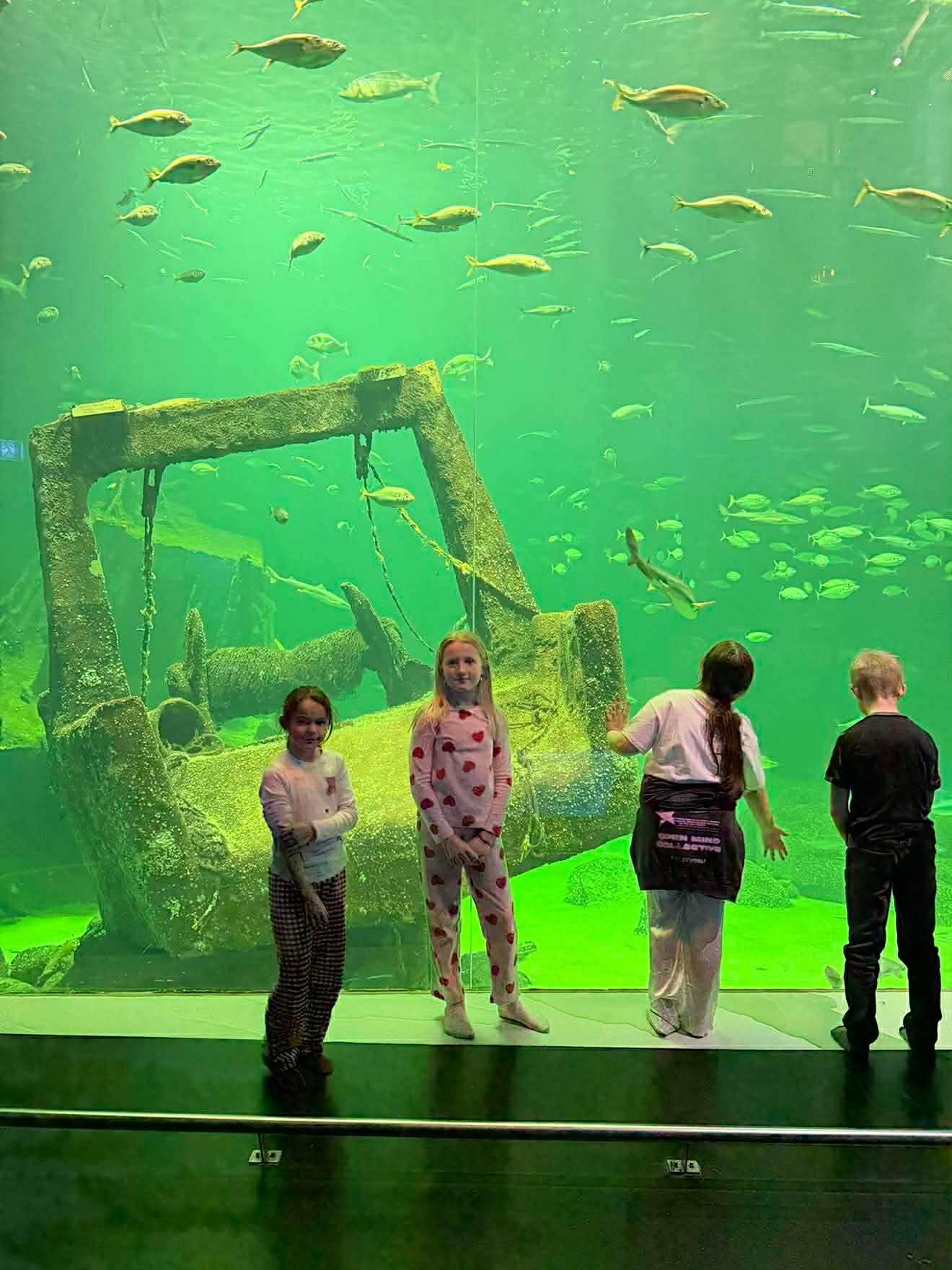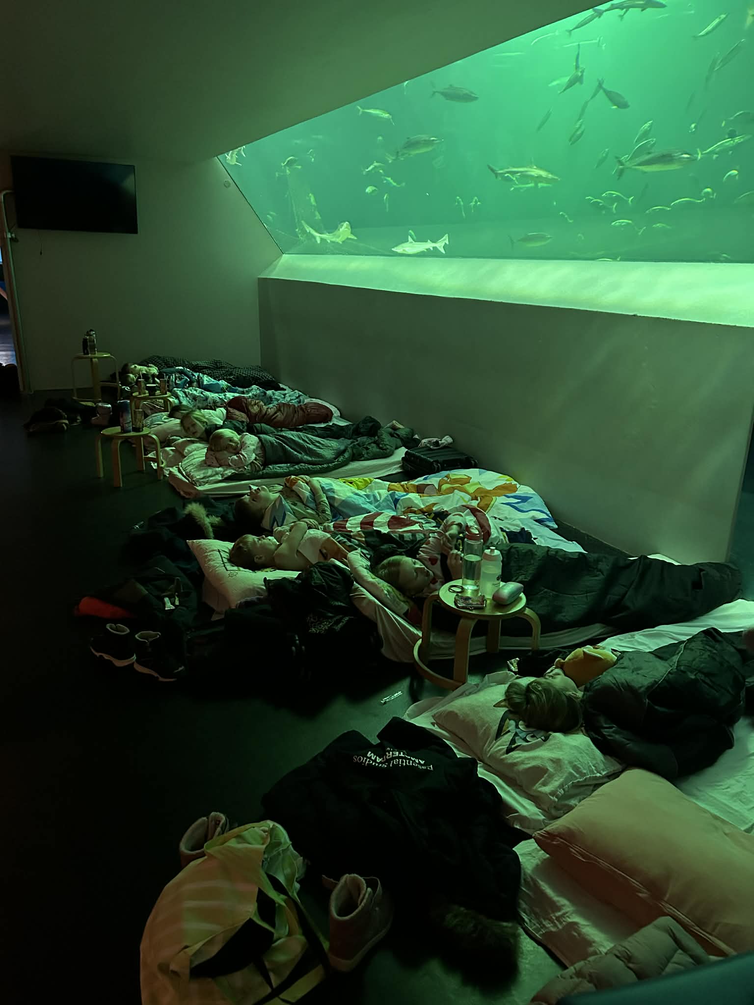 Efter en dag fyldt med læring og oplevelser var det tid til overnatning. Om aftenen hyggede vi os sammen, spiste kage, legede, så sæler i mørket, så fiskene blive fodret i det store akvarium og nød at være af sted som klasse uden den sædvanlige skoledag. Selvom det tog lidt tid at falde til ro, endte alle med at få sovet (nogle mere end andre) , så var vi klar til næste dags oplevelser. Fællesskabet i 2.X blev helt sikkert styrket.