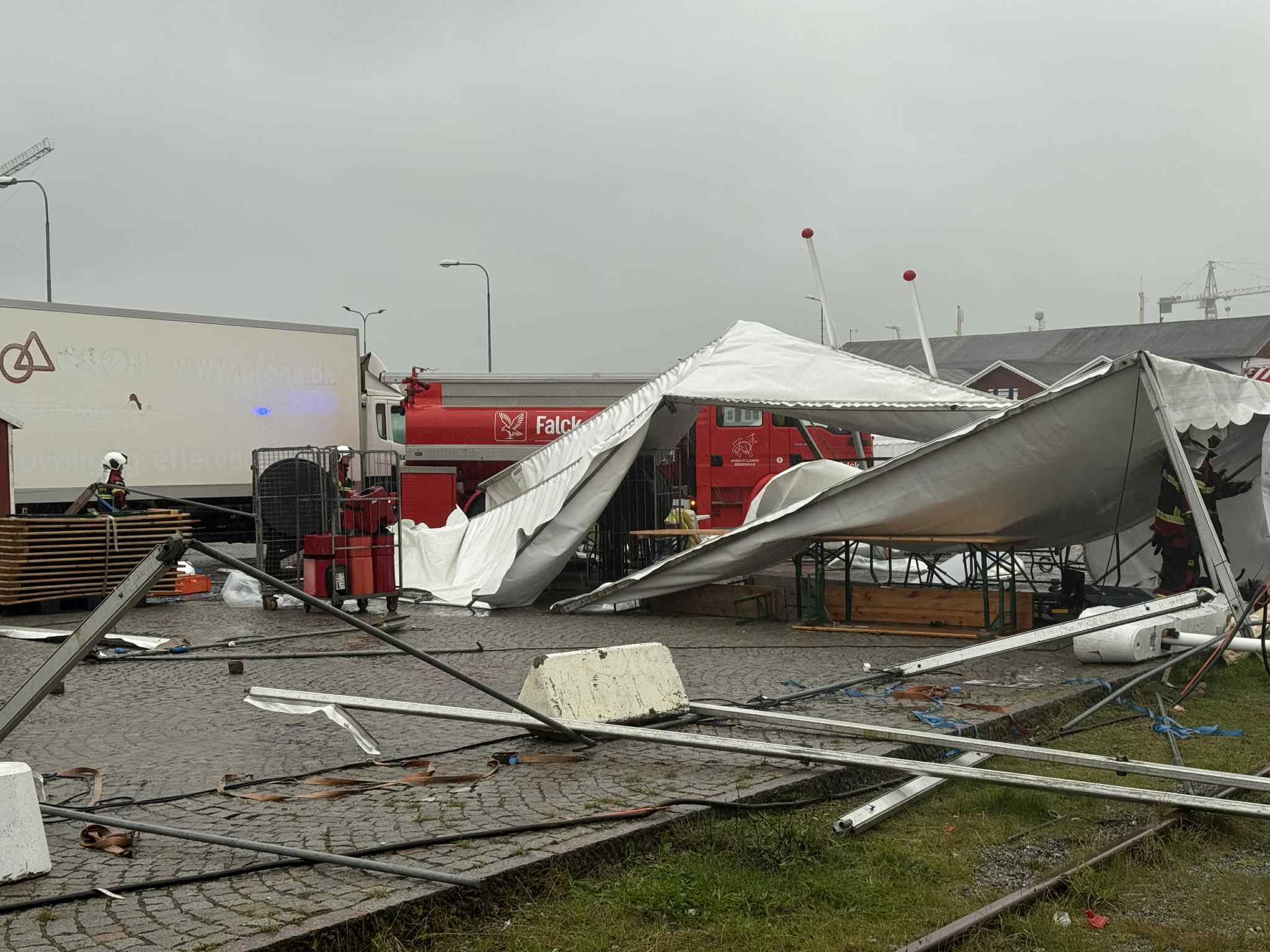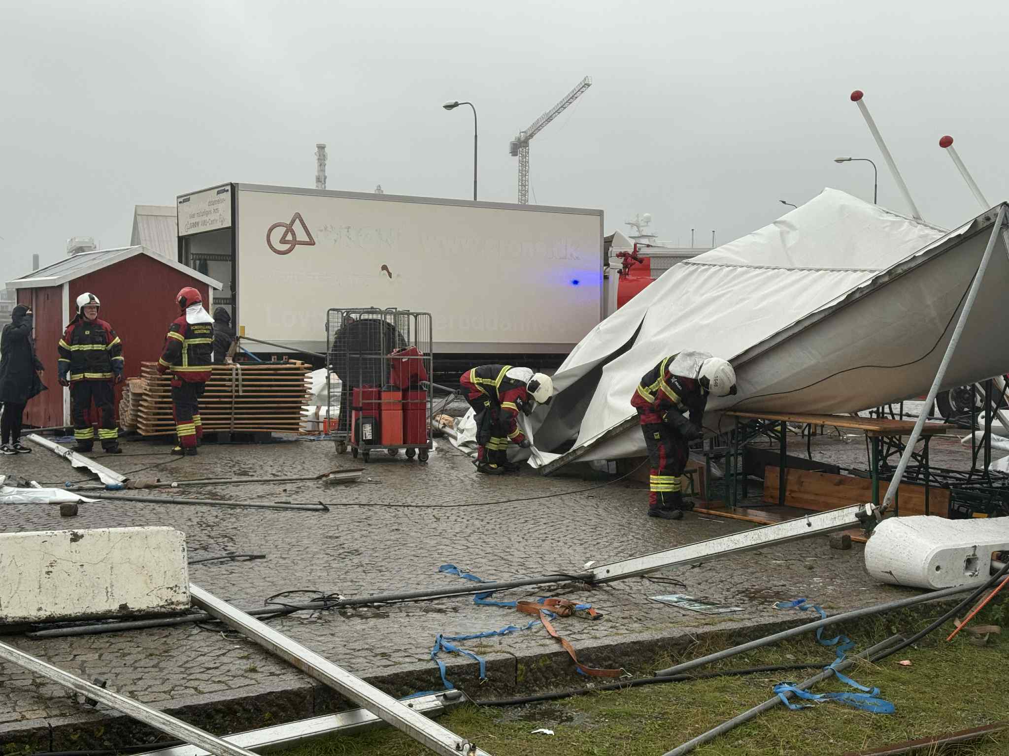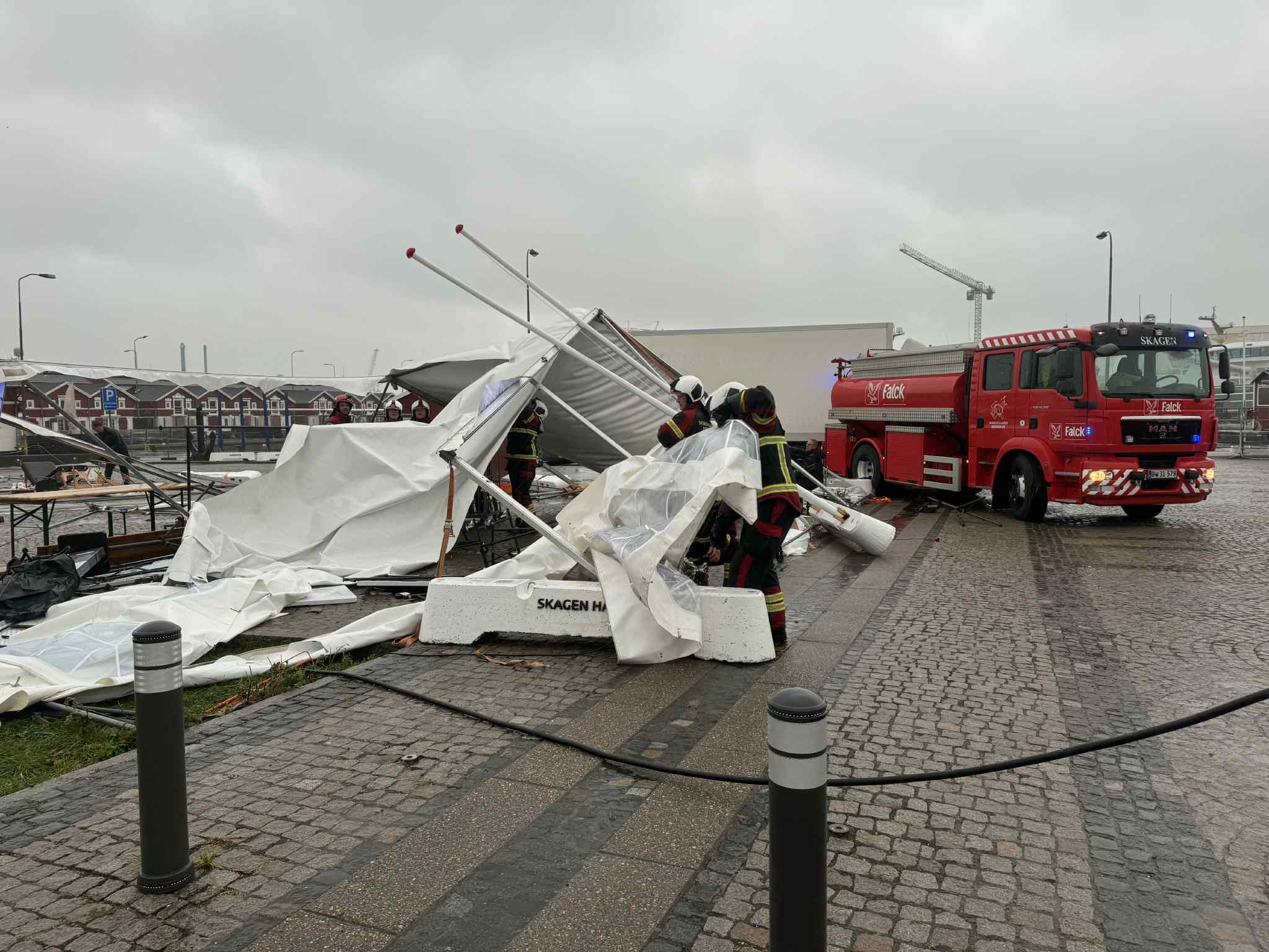 Det store marathontelt er ved at blæse fra hinanden i den kraftige vind, og brandmændene arbejder intenst sammen med folkene fra Toppen af Danmark for at få teltet sikkert ned, inden det gør skade på mennesker eller bygninger i nærheden.