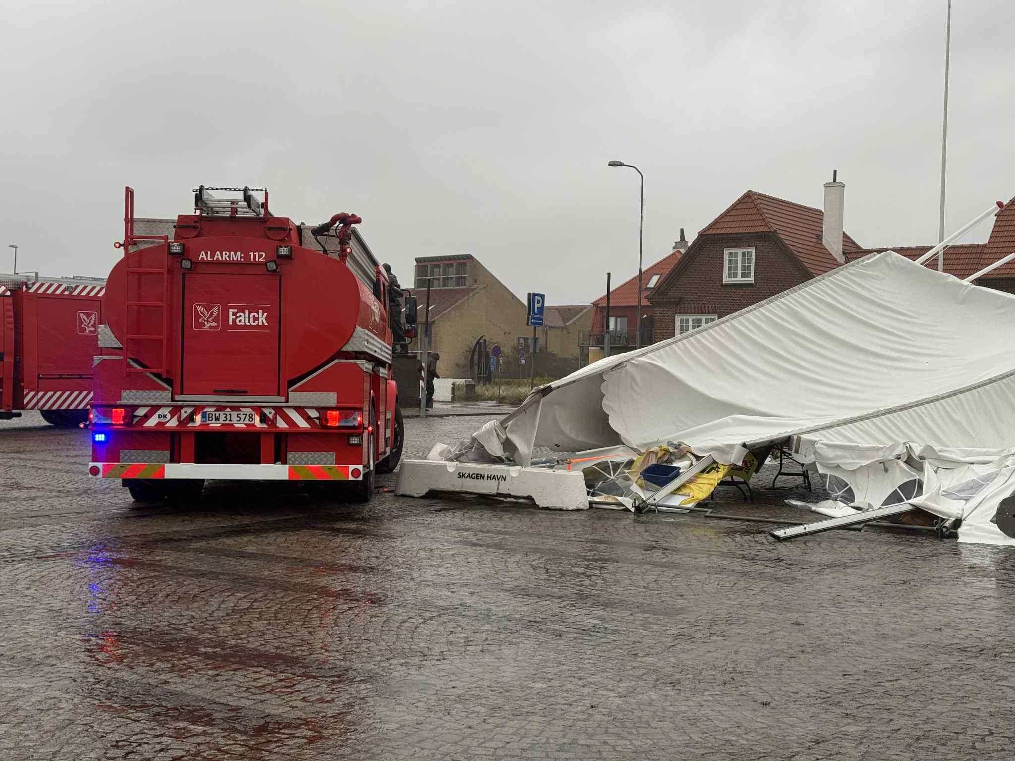 Der er fuld aktivitet på Fiskehuskajen i Skagen lige nu, hvor lokale brandfolk er kaldt ud for at hjælpe til ved det, der skulle have været start- og målområdet for Skagen Marathon 2025.