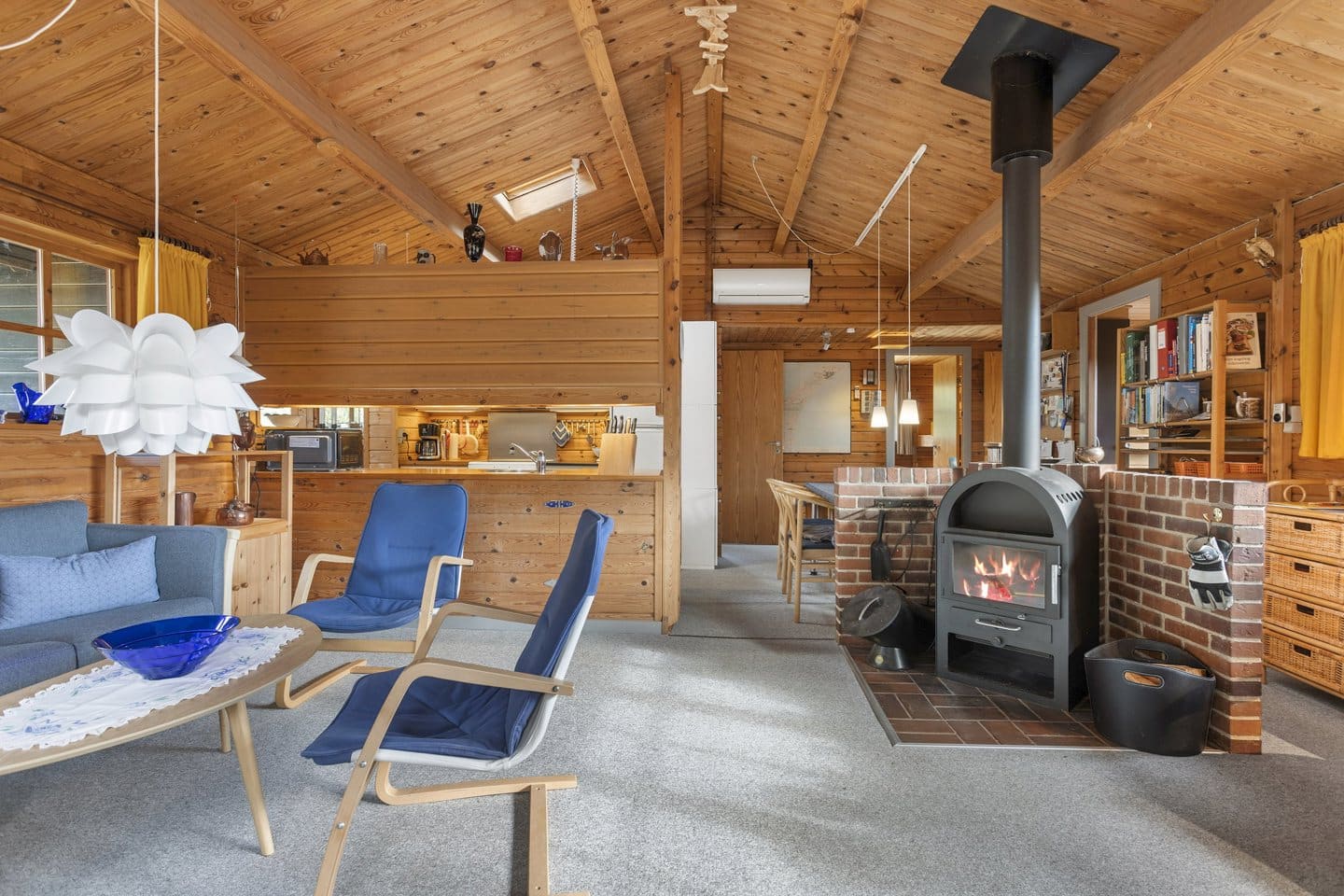 Indretning: Rummelig entré med garderobeplads. Åbent køkken-alrum og stue med god spiseplads, opdelt med centralt placeret brændeovn samt udgang til overdækket træterrasse mod sydvest. Endvidere tre værelser, badeværelse med bruseniche samt mindre kontorplads.