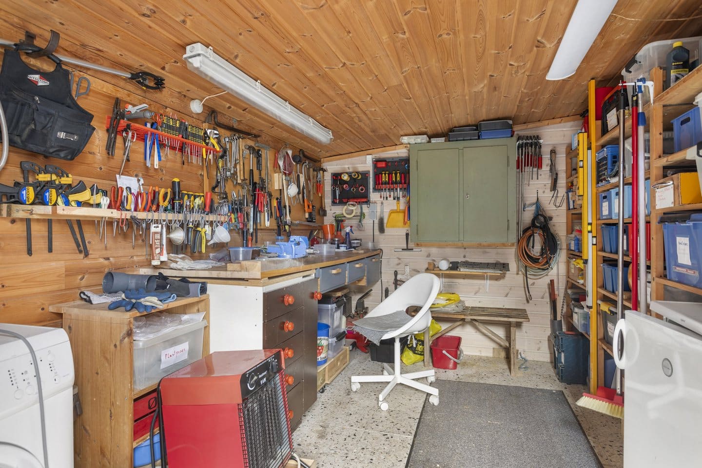 Ved entréen findes ligeledes en skøn morgenterrasse, hvor morgenkaffen og de første fuglefløjt kan nydes. Bag huset er isoleres udhus med vaskemaskine samt redskabs- og brændeskure.
