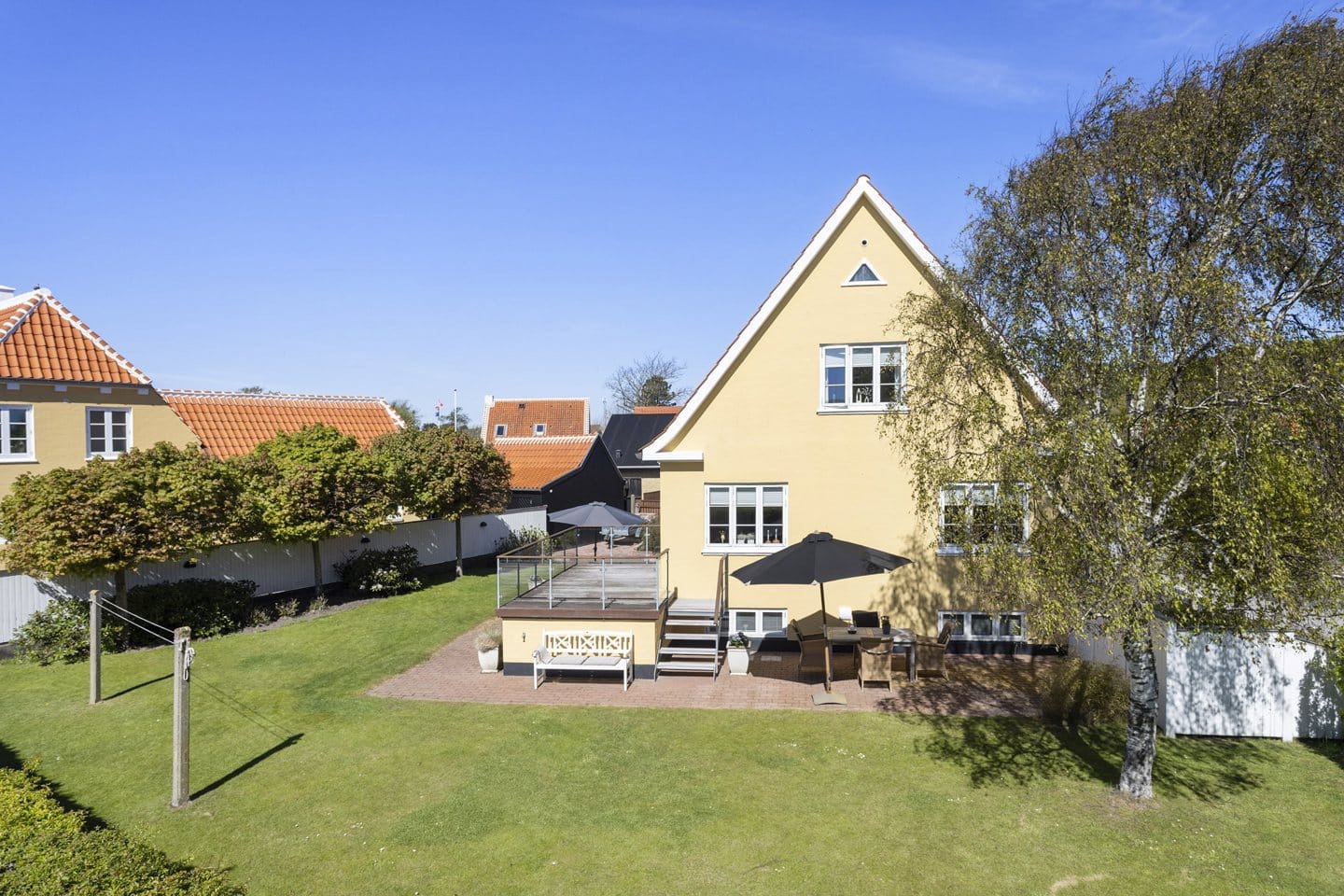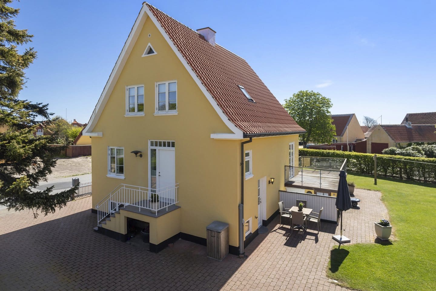 Udenfor venter en skøn og solrig have, som sikrer sol- og læmuligheder hele dagen. Haven er flot beplantet med bl.a. opstammede træer og masser af lys og luft – perfekt til afslapning og hyggelige stunder med familie og venner, mens udsigten til den ikoniske mølle ved By- og Egnsmuseet kan nydes. Ejendommen har desuden gode parkeringsforhold med en velanlagt indkørsel.