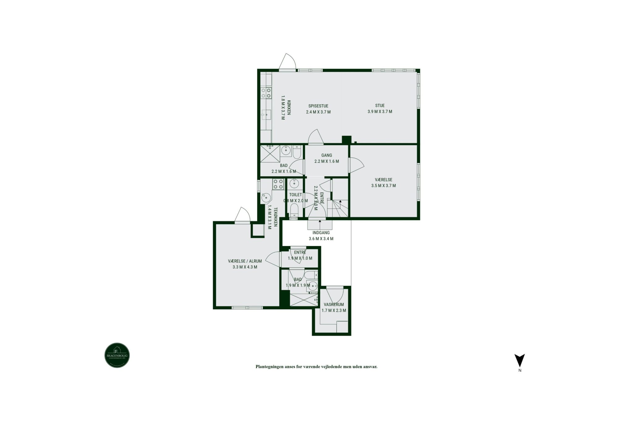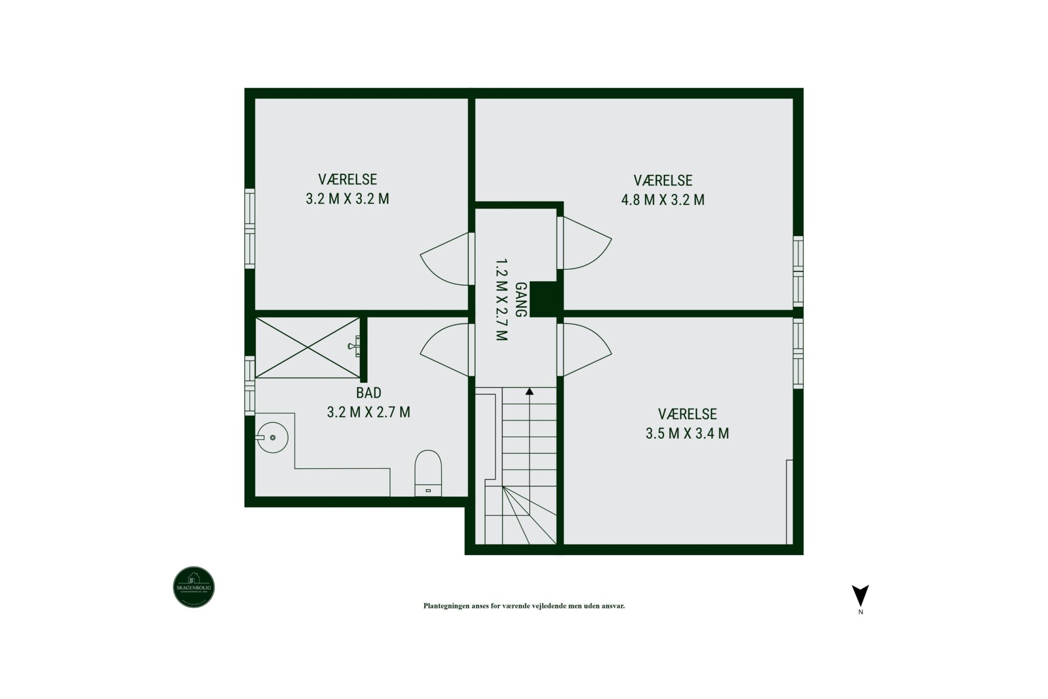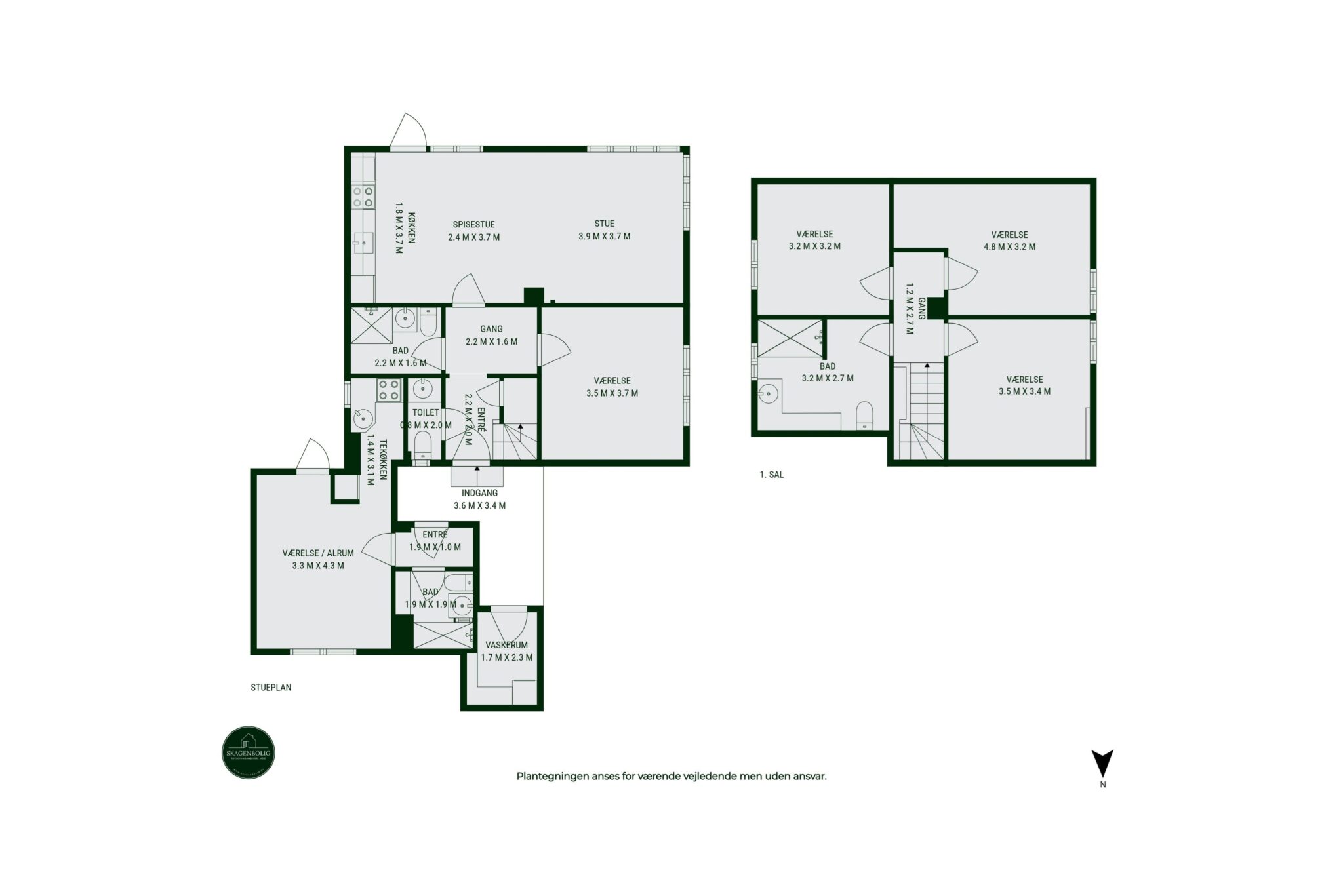 Boligen er fordelt på to etager og rummer i alt 142 m² med fire værelser, to badeværelser samt et gæstetoilet.