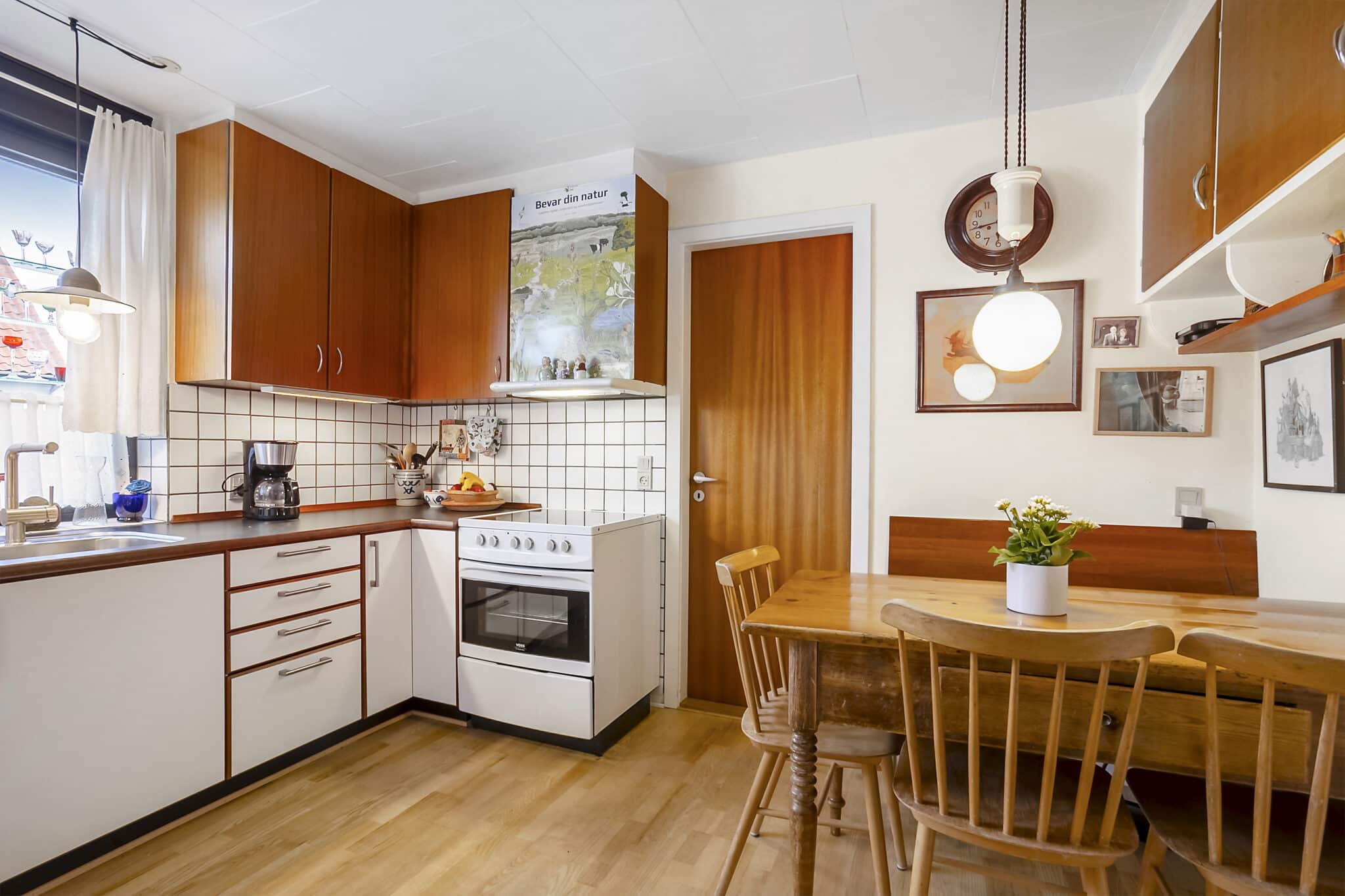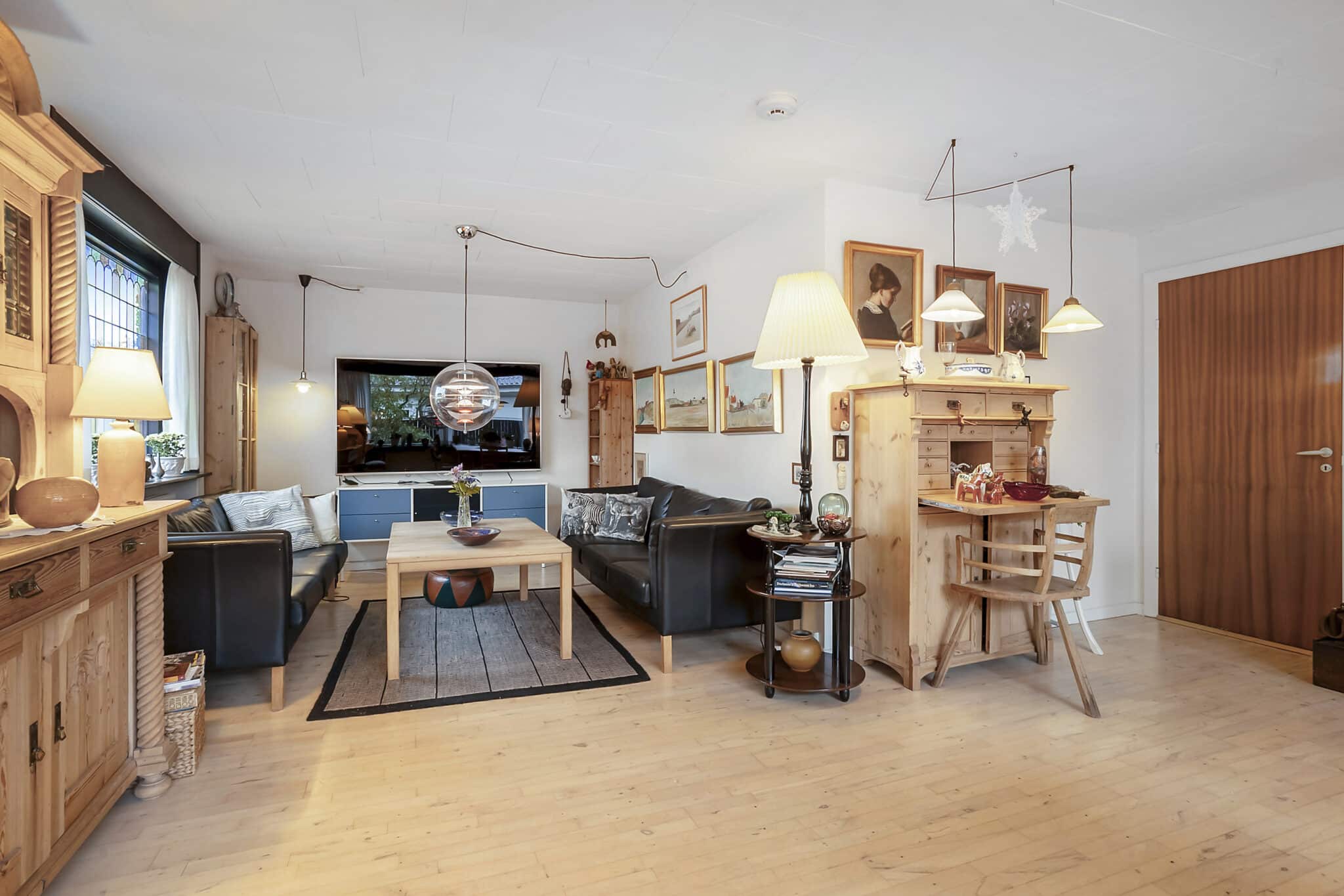 Fra gangen fører en trappe op til 1. salen, hvor en stor stue med udgang til svalegang skaber et lyst og indbydende opholdsrum. Her finder du også tre gode soveværelser samt et badeværelse, hvilket gør etagen ideel til familielivet eller gæster.