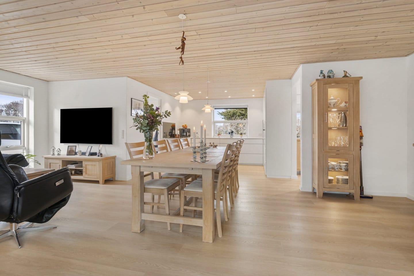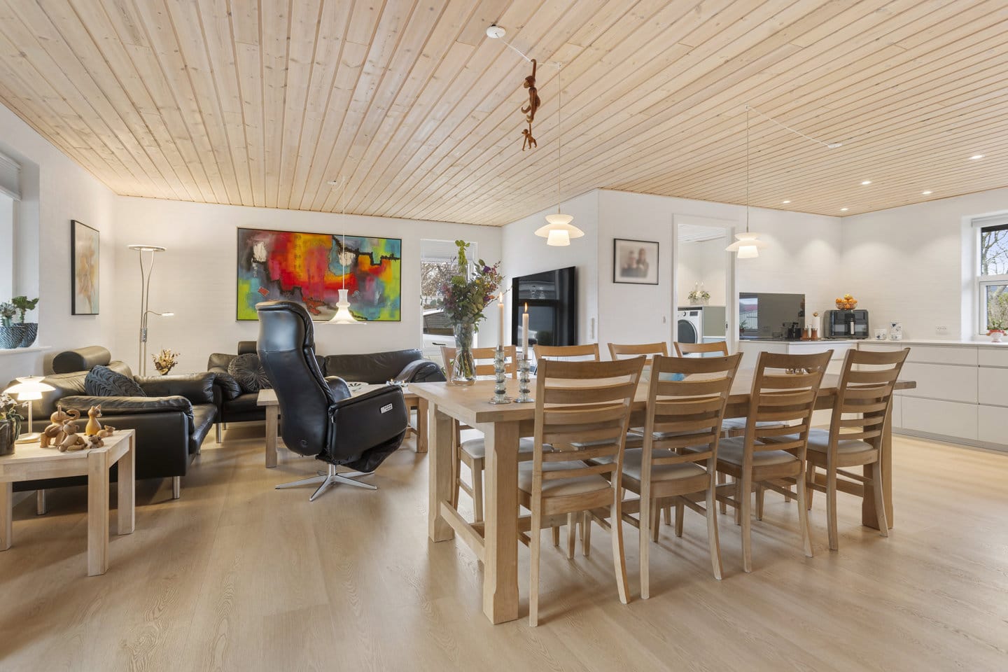 Køkken/alrum/stue er samlet i ét åbent og lyst opholdsrum, hvor familien naturligt samles omkring måltider og dagligdagen. Her er god plads til både spiseafdeling og opholdsstue. Der er gulvvarme i køkken/alrum/stue samt i bryggers, badeværelse og gæstetoilet. Villaen blev indvendigt renoveret i 2023 og fremstår pæn og tidssvarende.