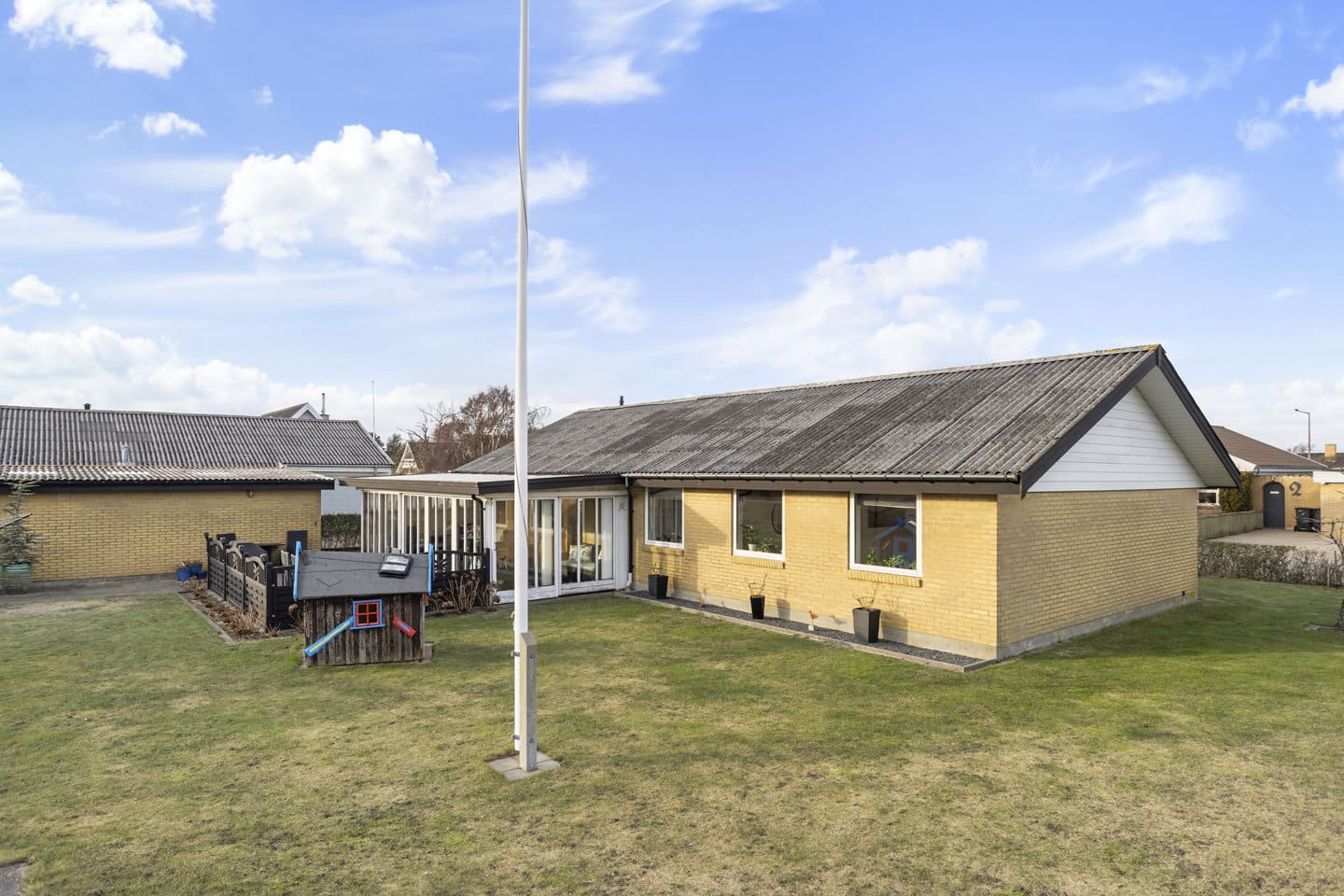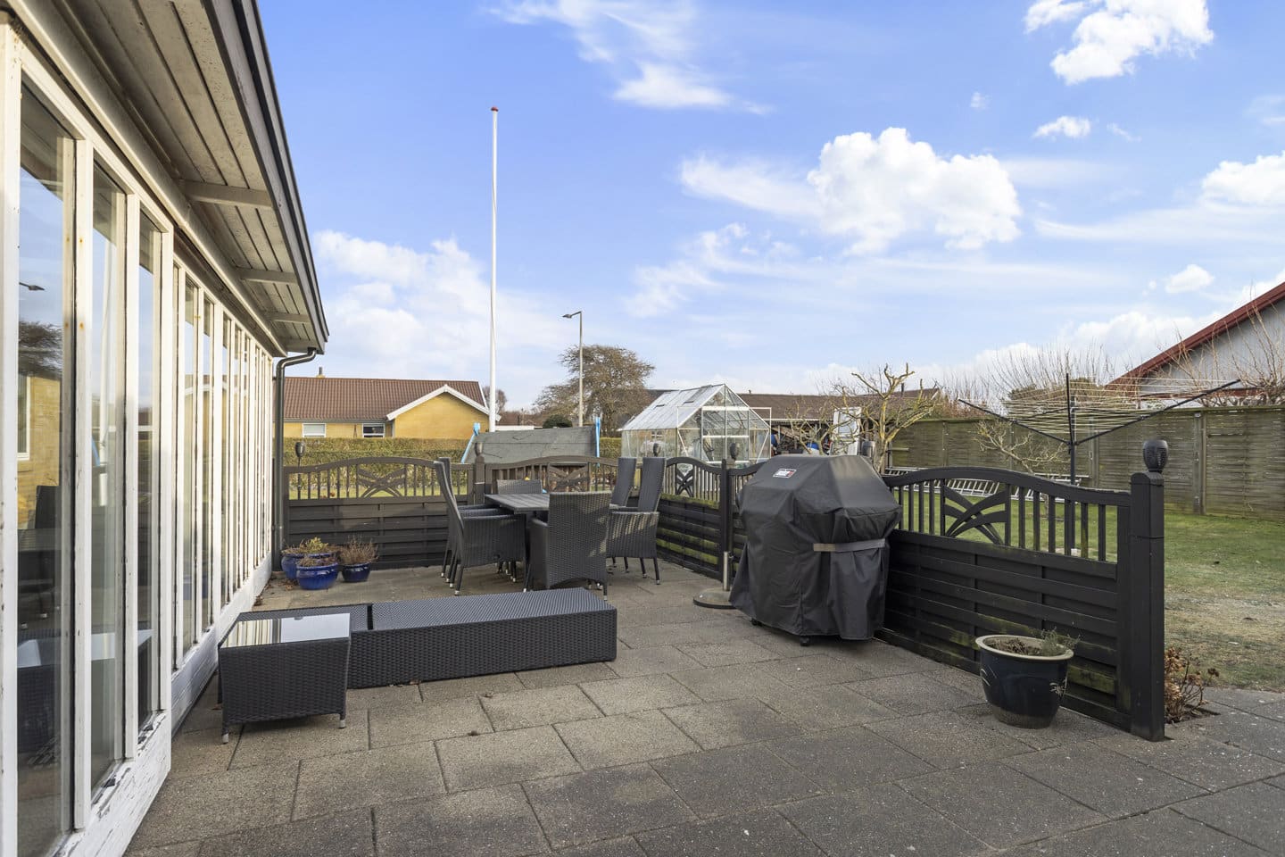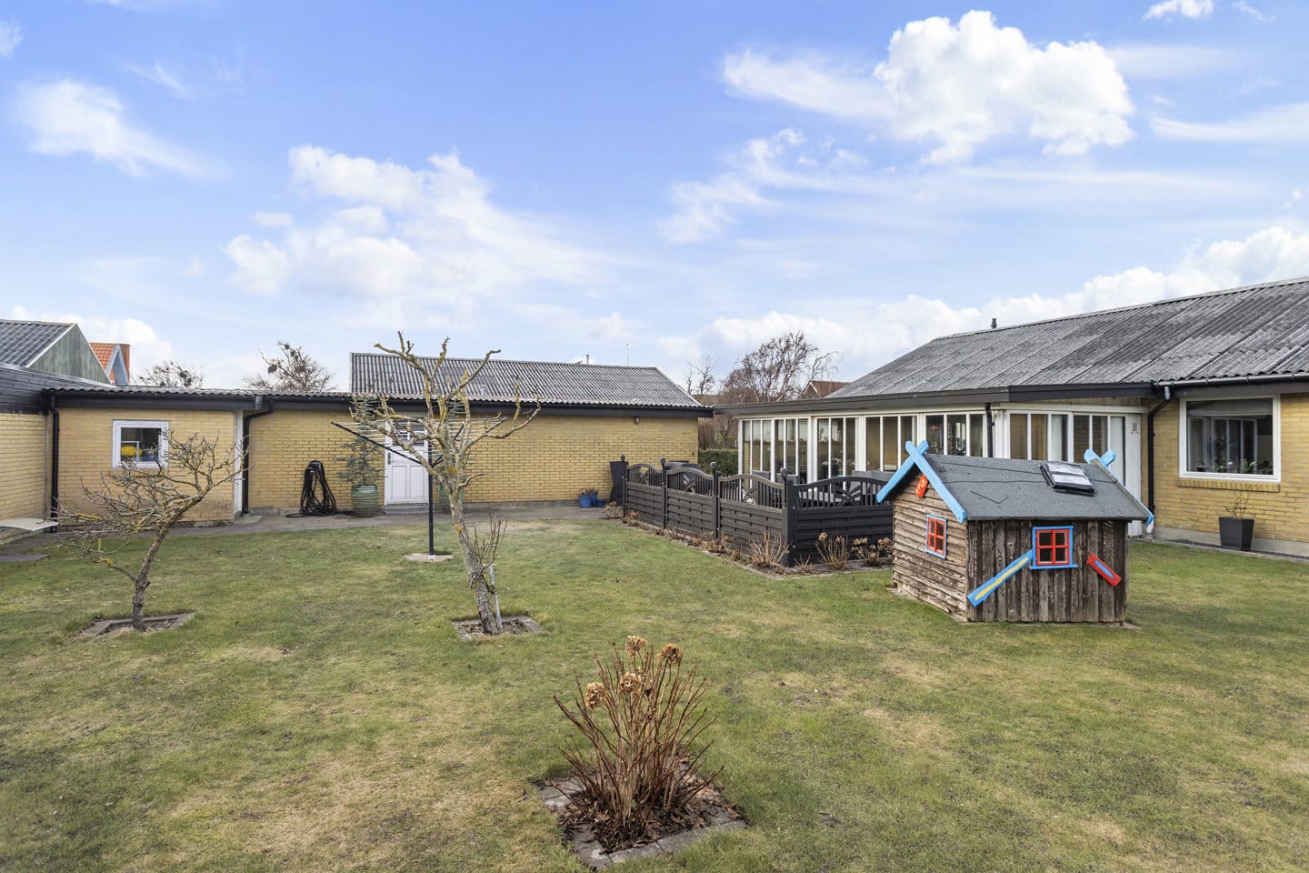Udenfor findes en overskuelig have med plads til leg, ophold og terrassemiljø. Haven er let at holde og giver gode muligheder for både børneleg og afslapning.