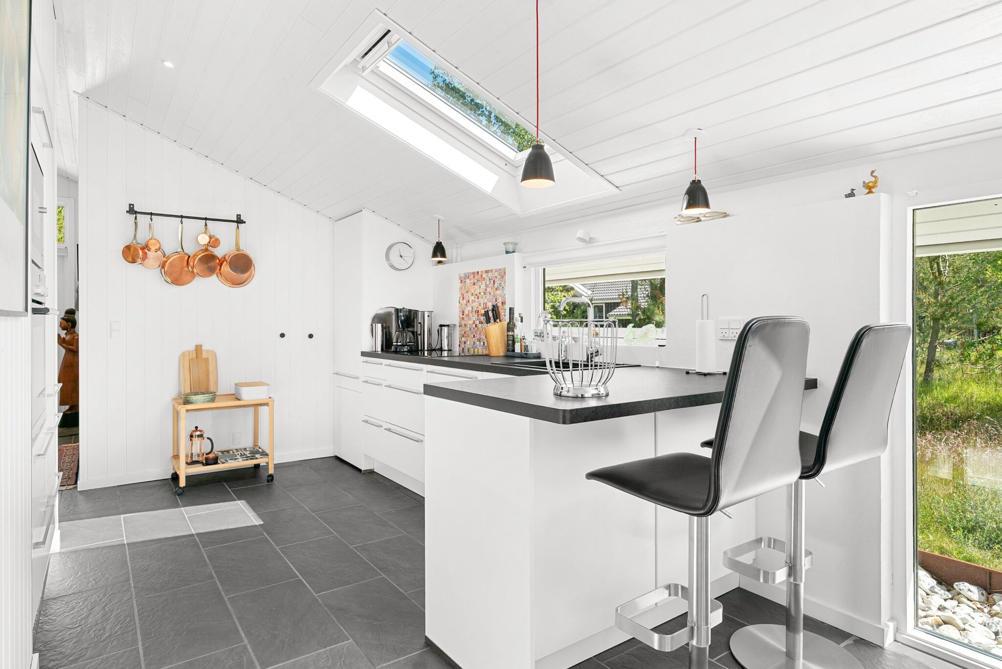 Indendørs byder huset på et lyst og åbent køkken-alrum med ovenlysvinduer, der trækker dagslyset flot ind i rummet. Stuen har en hyggelig brændeovn og direkte udgang til terrasse og det smukke, lukkede naturareal omkring huset.