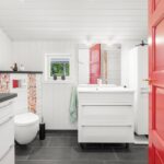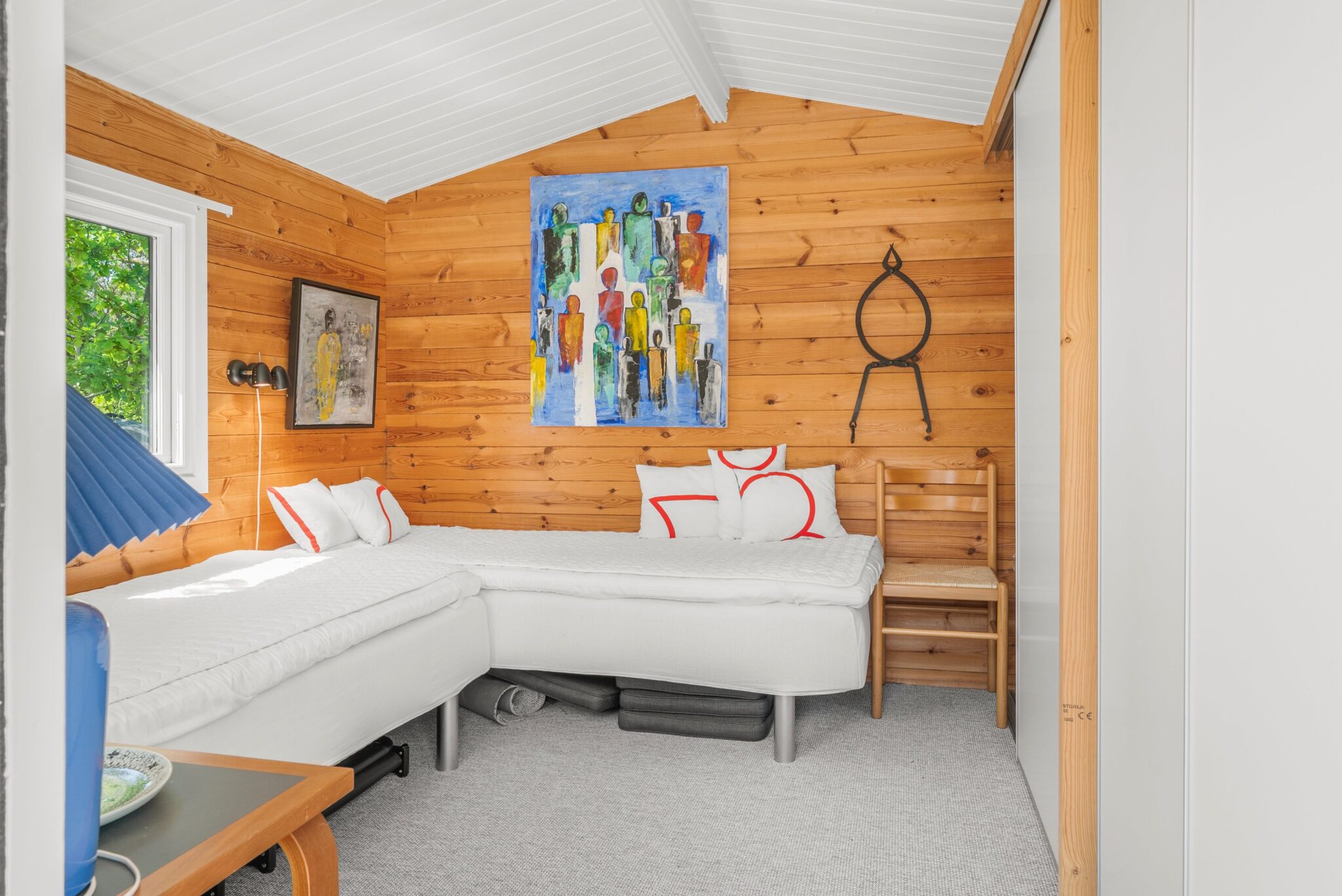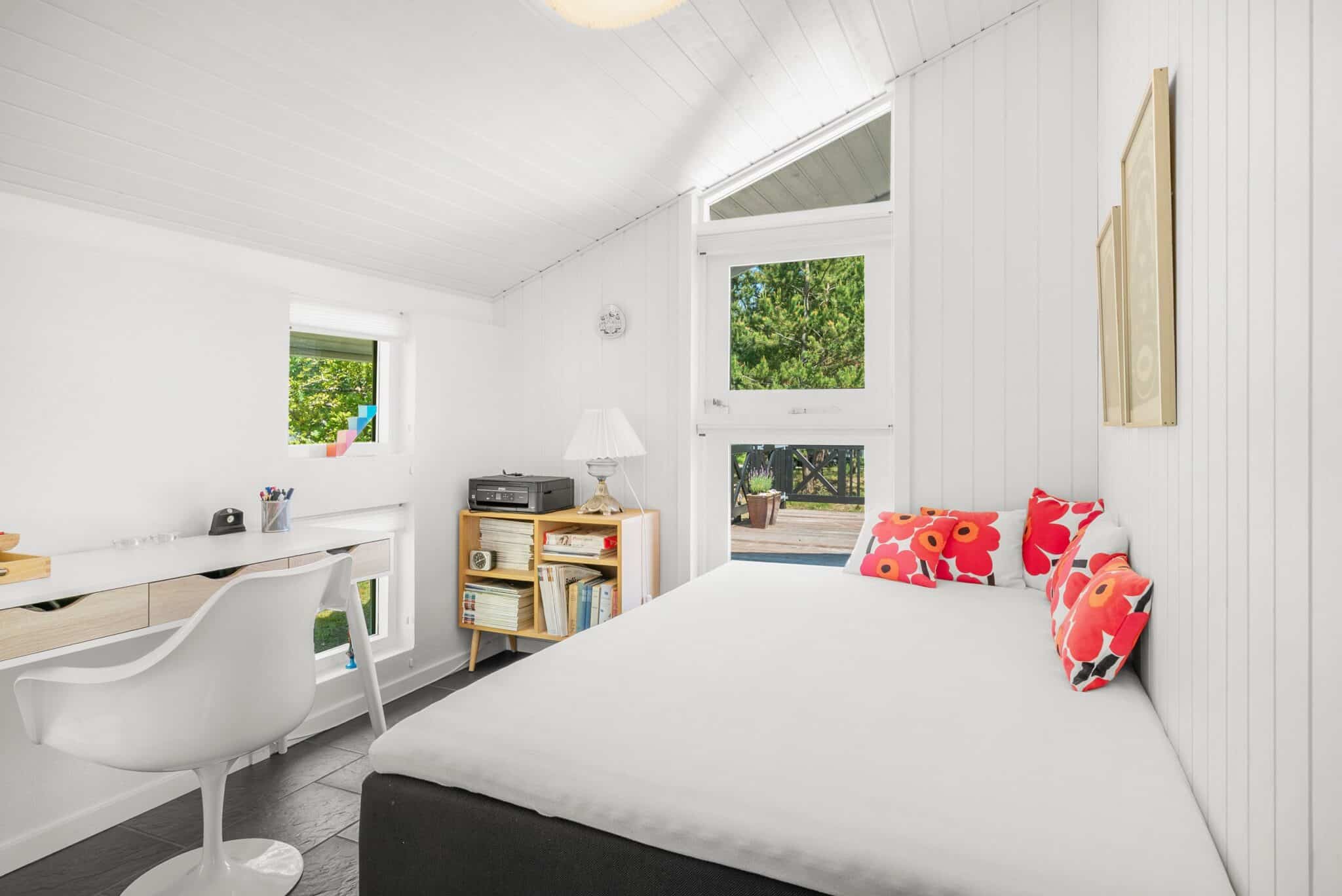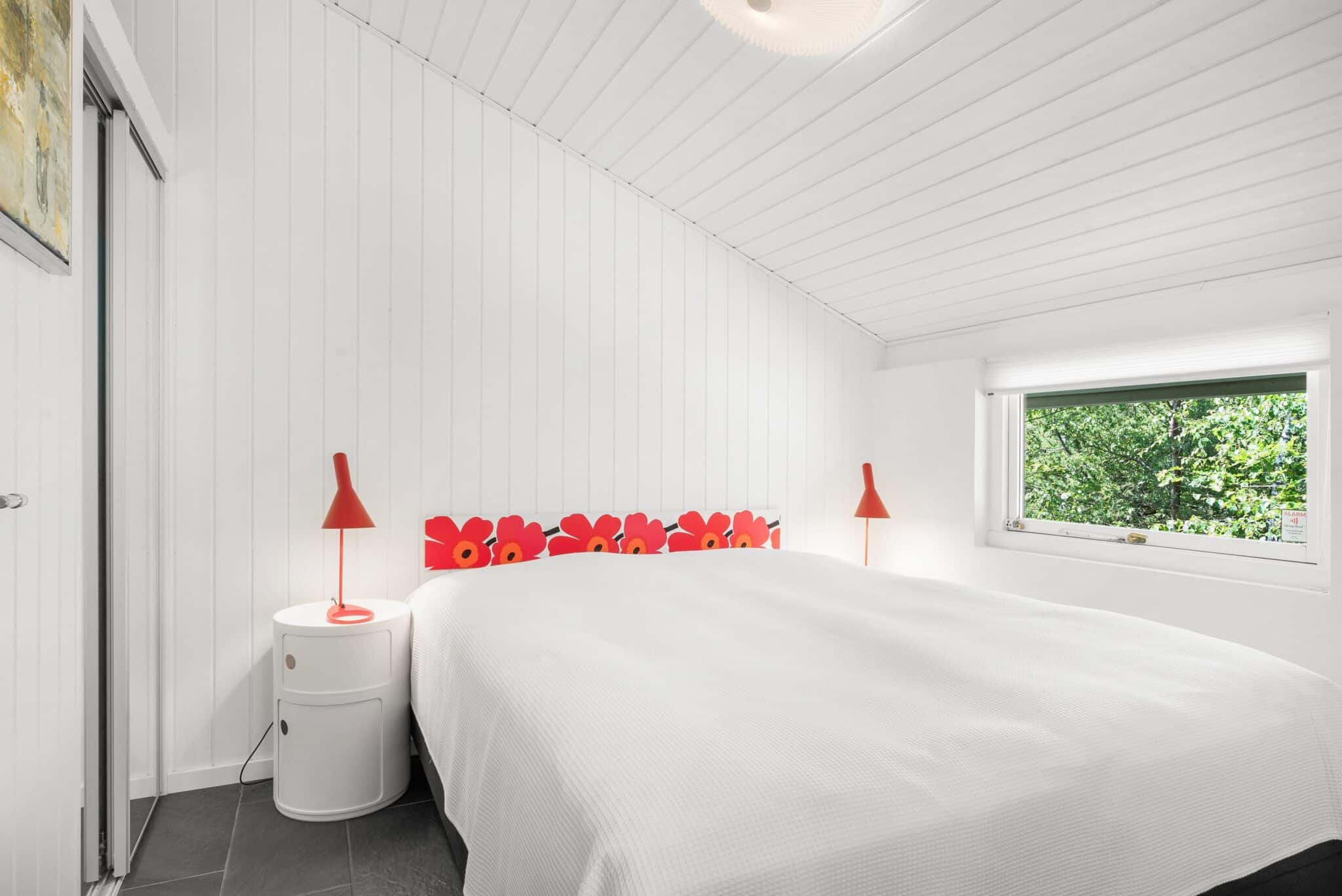 Der er to gode værelser samt et moderne badeværelse med væghængt toilet, bruseniche og vaskemaskine. Loftet er åbent til kip, hvilket giver en skøn rumfornemmelse og arkitektonisk lethed i hele huset.