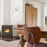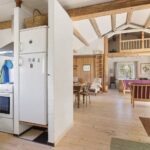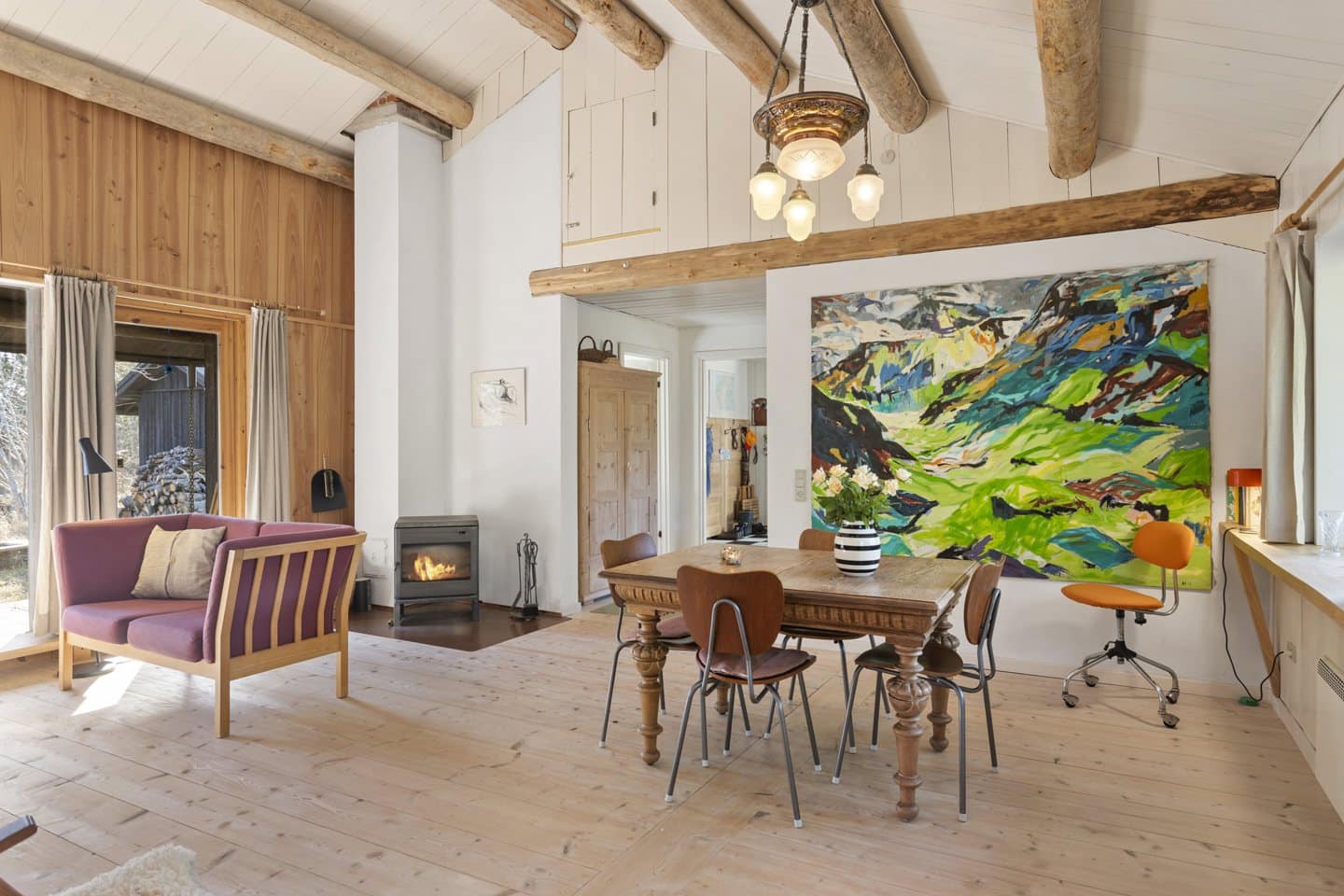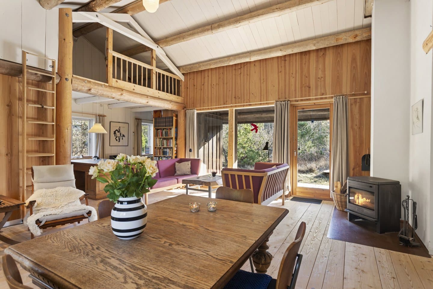 Køkken i åben forbindelse med stuen. Køkkenet er charmerende og landligt og byder på en hyggelig lille spiseplads samt udgang til overdækket terrasse mod vest. Stuen er med loft til kip og med masser af lysindfald. Her der er udgang til overdækket terrasse mod syd, brændeovn og opgang til stor hems.