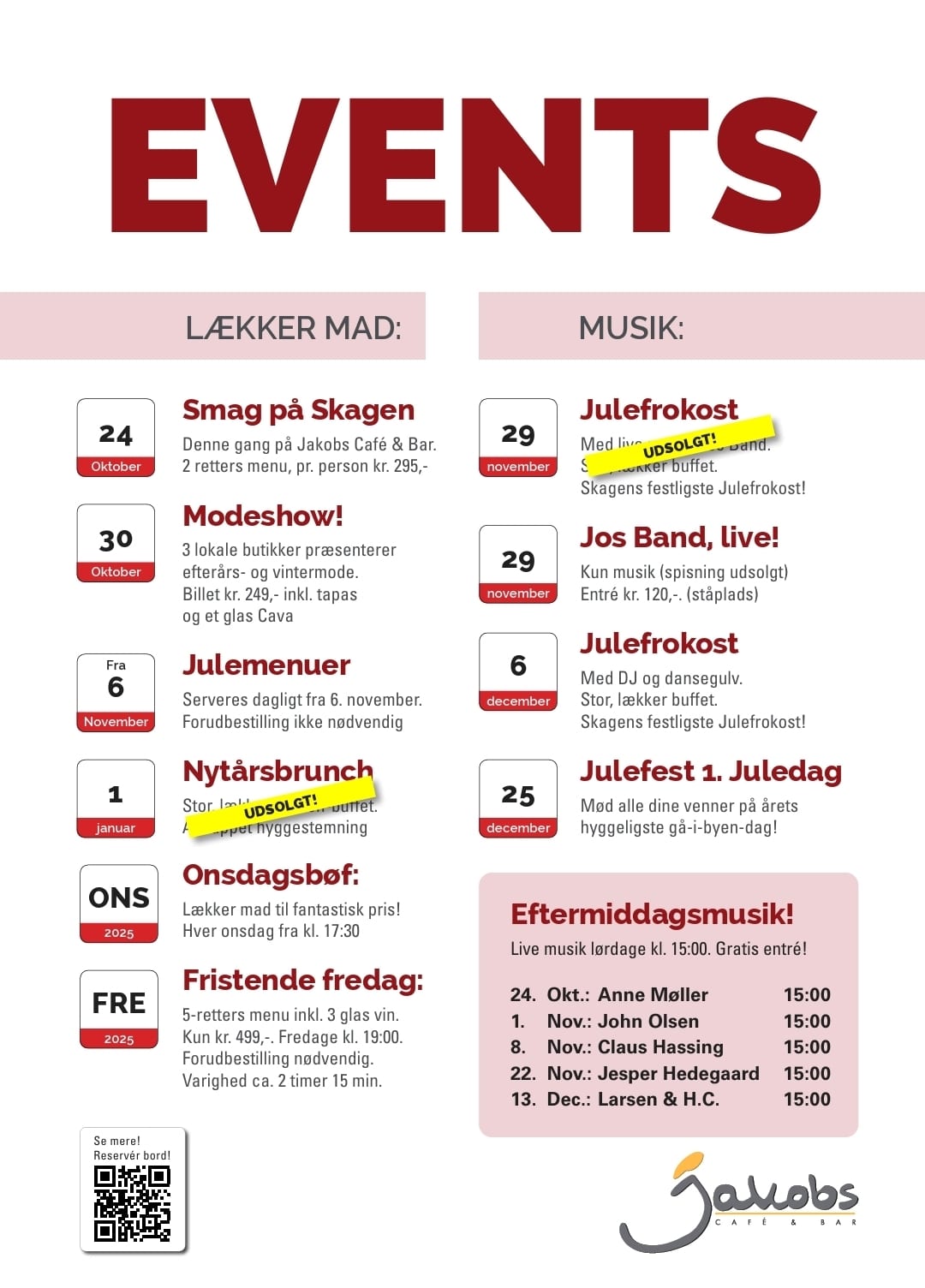 Fra den 6. november er det tid til julemenuerne, som serveres dagligt uden krav om forudbestilling. Og når julestemningen for alvor rammer, inviterer Jakobs Café & Bar til Skagens festligste julefrokoster med både live musik og DJ.