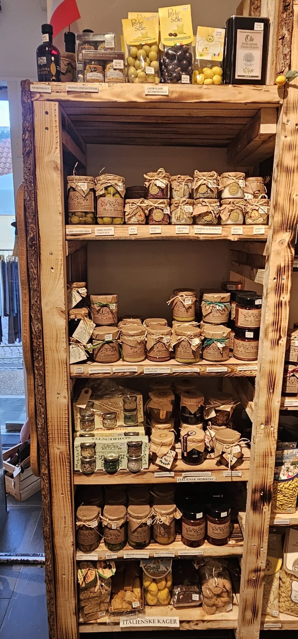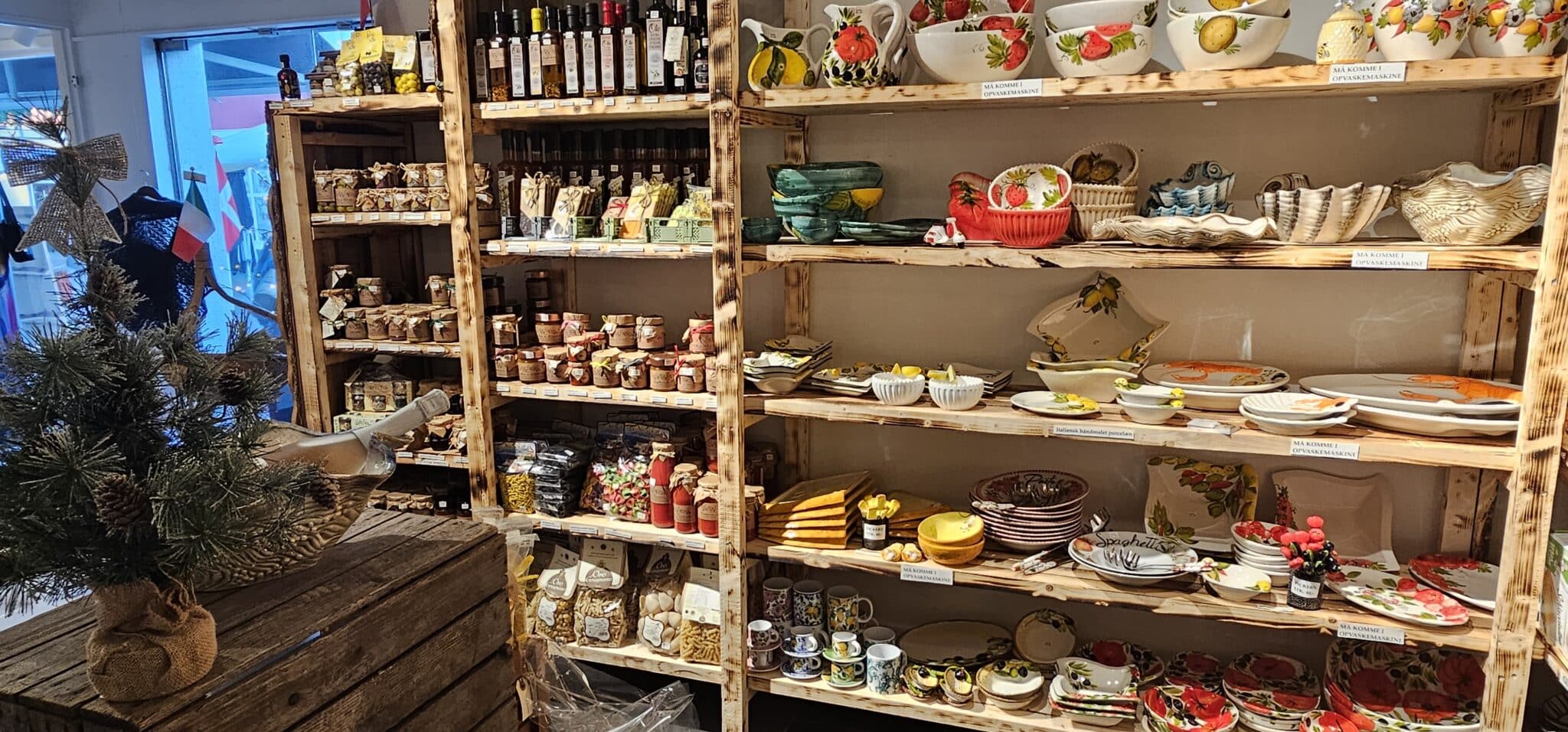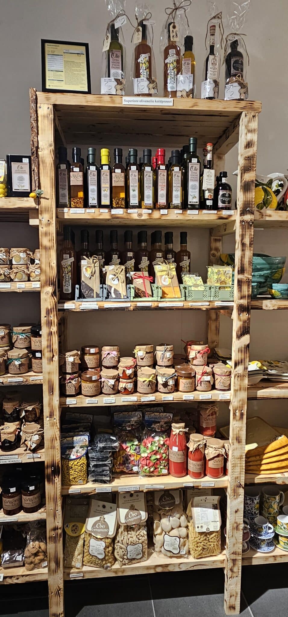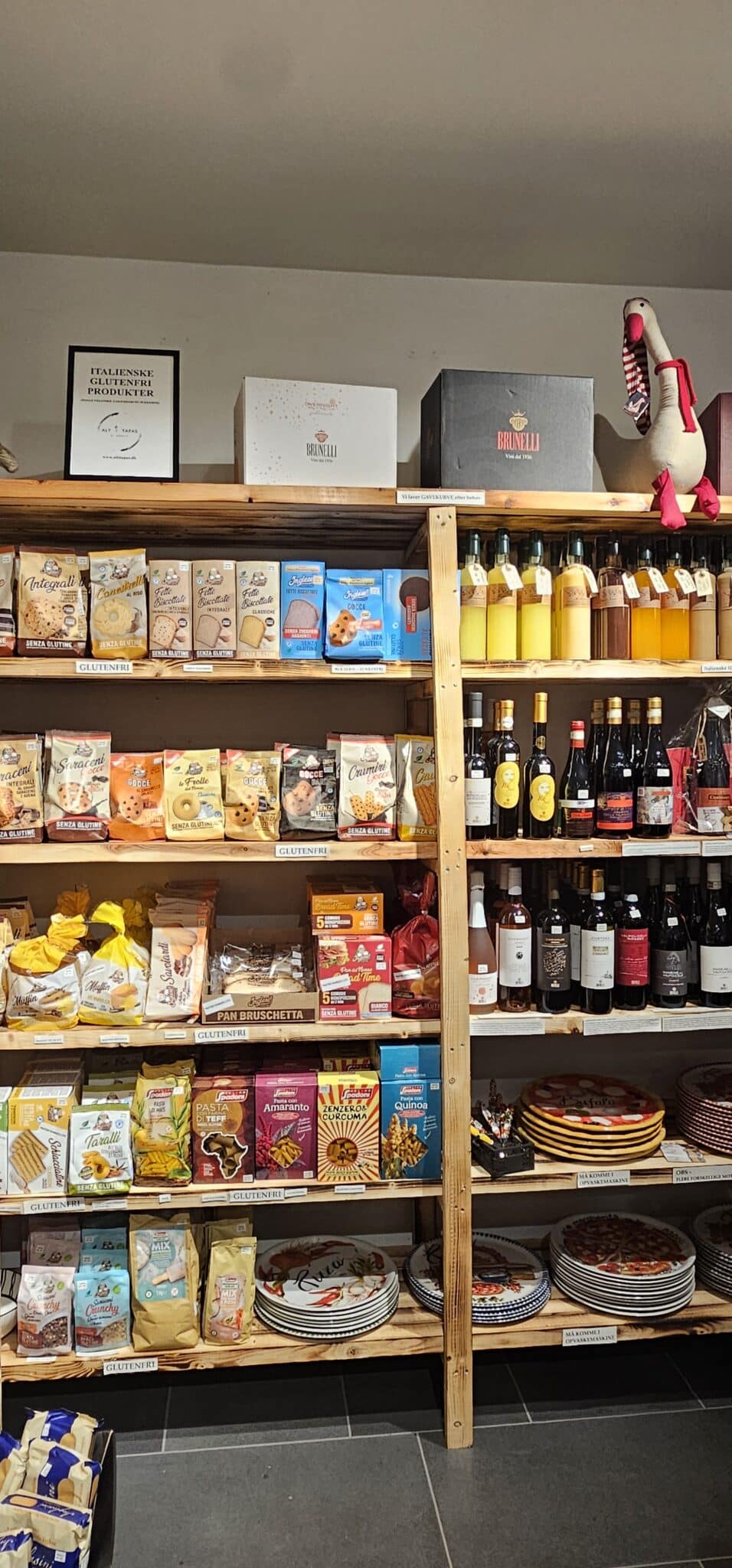 Hylderne i butikken rummer blandt andet glutenfrie specialiteter fra Inglese-Glutenfree, cremede pestoer, olier og tapenader fra Fattoria Terranova samt det smukkeste håndmalede keramik fra Ceramiche Edelweiss – alt sammen håndværk, hvor kvalitet og tradition er i centrum.