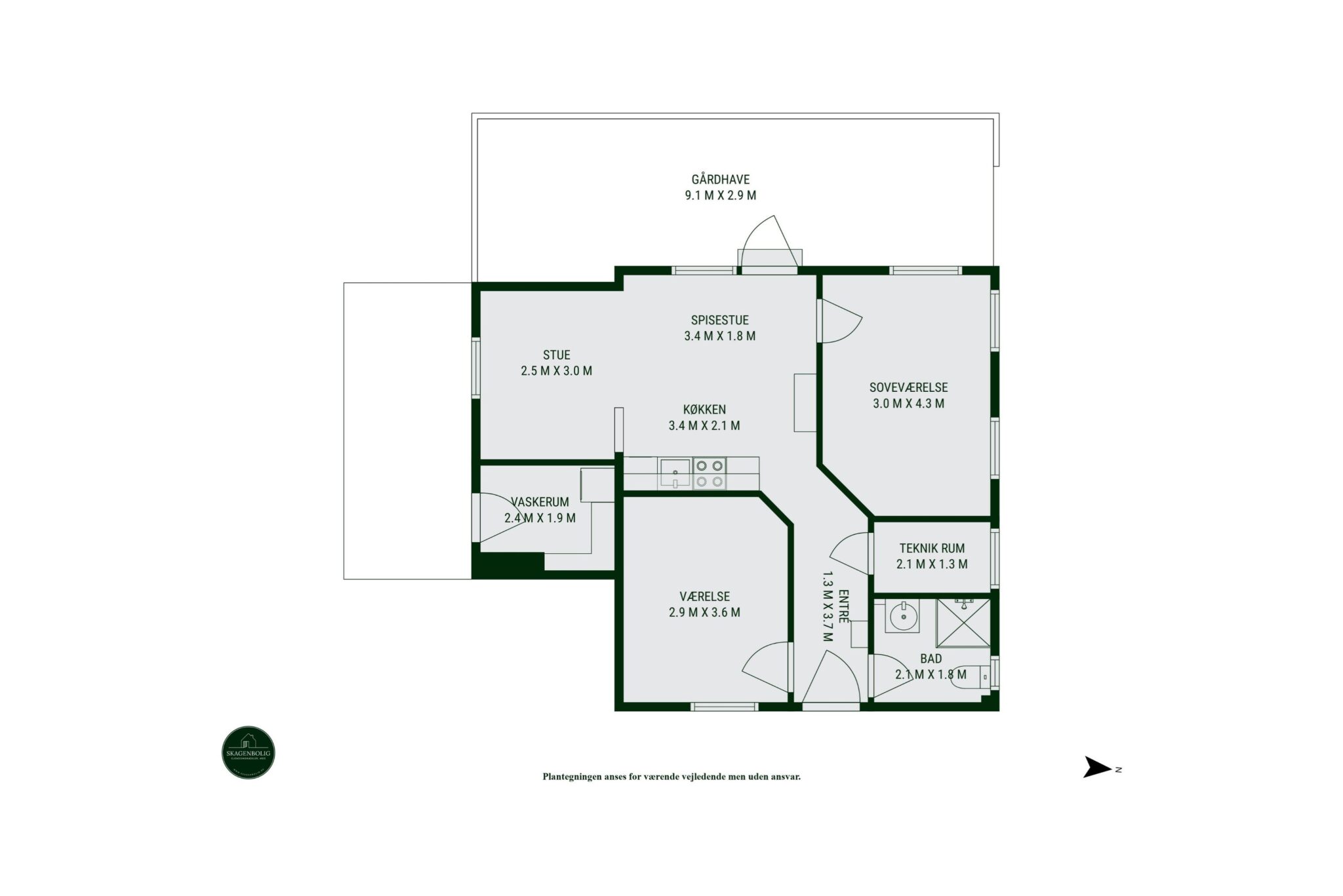 Indvendigt møder I en lys og venlig bolig, hvor planløsningen er veludnyttet. Her er entré, to rummelige værelser, badeværelse, teknikrum samt et lyst køkken-alrum, hvor spisestue og tv-stue samles i ét åbent opholdsmiljø. Det er her, hjemmets hjerte banker – med god plads til samvær, måltider og afslapning.