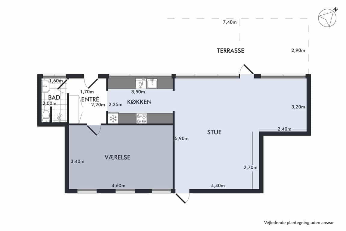 Stuen har en god størrelse og giver mulighed for at etablere en ekstra væg, hvis behovet for et ekstra værelse opstår. Dermed kan boligen nemt tilpasses, hvad enten du er par, en lille familie eller ønsker plads til hjemmekontor eller gæsteværelse. Fra stuen er der direkte udgang til en hyggelig vestvendt terrasse samt adgang til den østvendte gårdhave – perfekte rammer for både morgen- og aftensol.