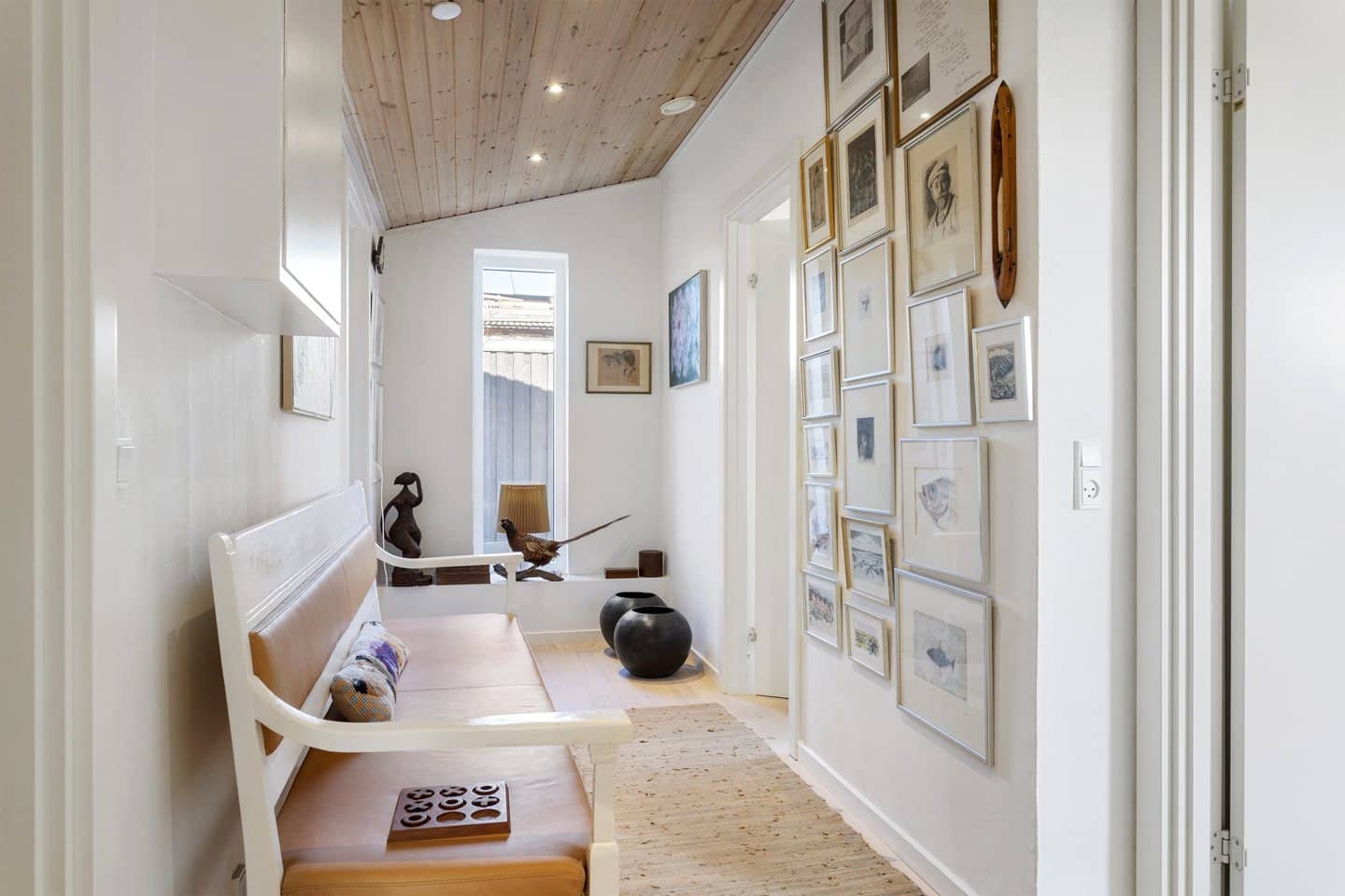 Entré kombineret med bryggers. Fordelingsgang med to værelser samt badeværelse med bruseniche. Åbent køkken-alrum med god spiseplads, og udgang til både syd- og vestvendt gårdmiljø. I hævet niveau findes stue med pejseindsats og udgang til svalegang mod haven.