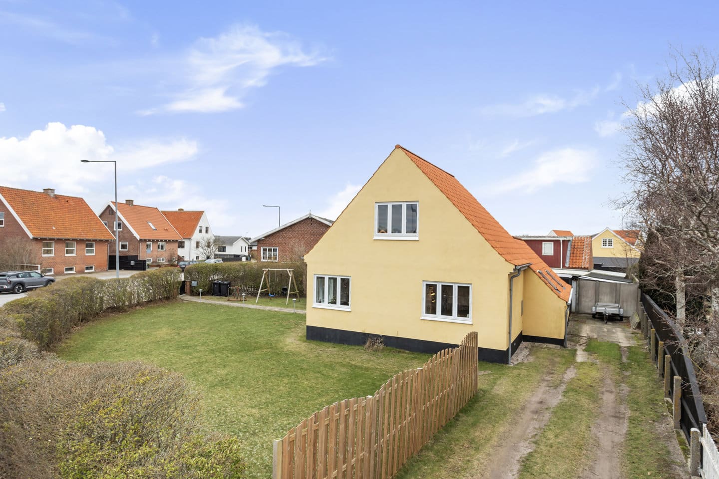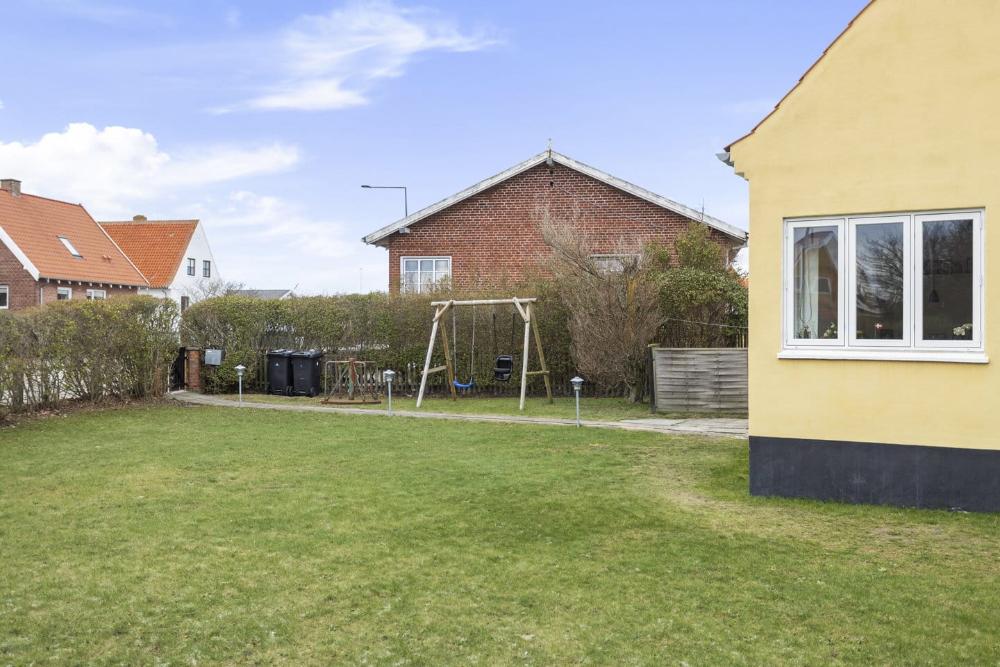 Udenfor venter en nem og overskuelig have med gode muligheder for at indrette hyggelige terrassemiljøer. Her er plads til både afslapning og leg i rolige omgivelser.