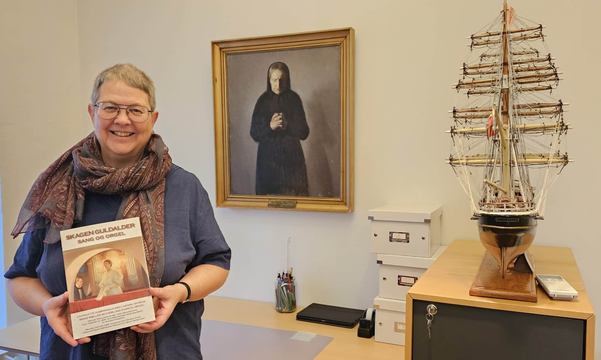 Ved lørdagens koncert præsenteres også hendes nye bog Skagen Guldalder, sang og orgel. Bogen udspringer af hendes nysgerrighed på tre malerier af P.S. Krøyer og Michael Ancher, der skildrer en koncert i Skagen Kirke i 1908, hvor komponisten Hakon Børresen akkompagnerer en sangerinde på det gamle Demant-orgel – et instrument, der i dag står i Sognehuset.