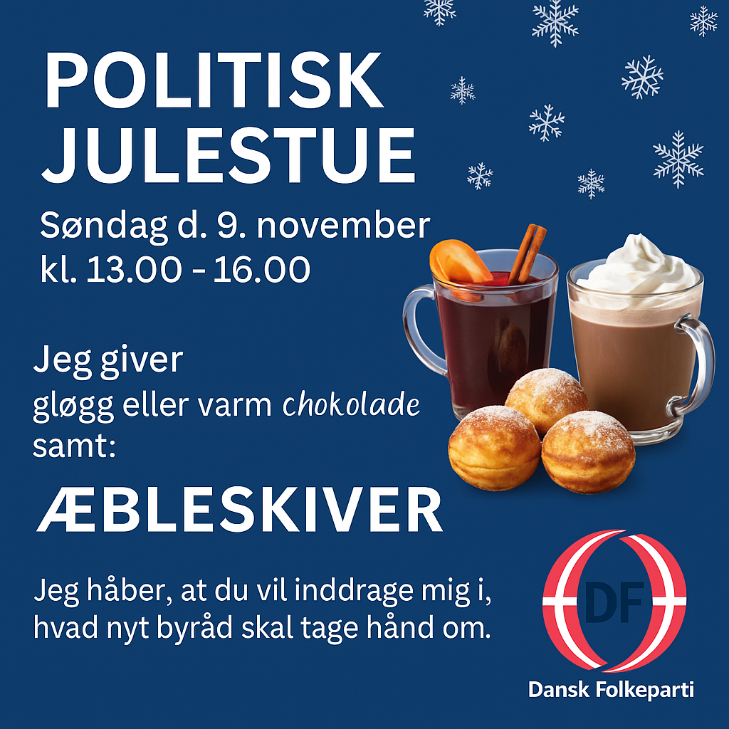 Her inviterer byrådskandidat Mathias Rump Hansen fra Dansk Folkeparti, søndag den 9. november kl. 13.00-16.00 til en politisk julestue, hvor alle interesserede borgere kan kigge forbi til en uformel snak om kommunens fremtid – over en kop varm gløgg eller chokolade og et par friskbagte æbleskiver.