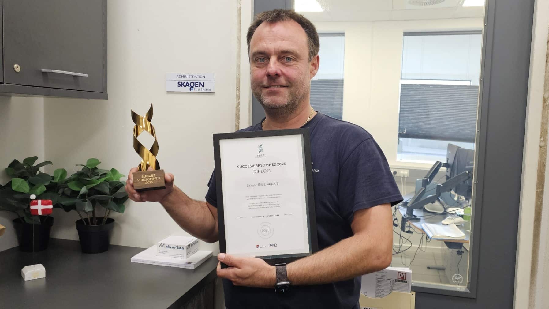 Jesper Diget Hermansen, direktør og ejer af Skagen El & Energi med prisen "Succesvirksomhed 2025" i hånden