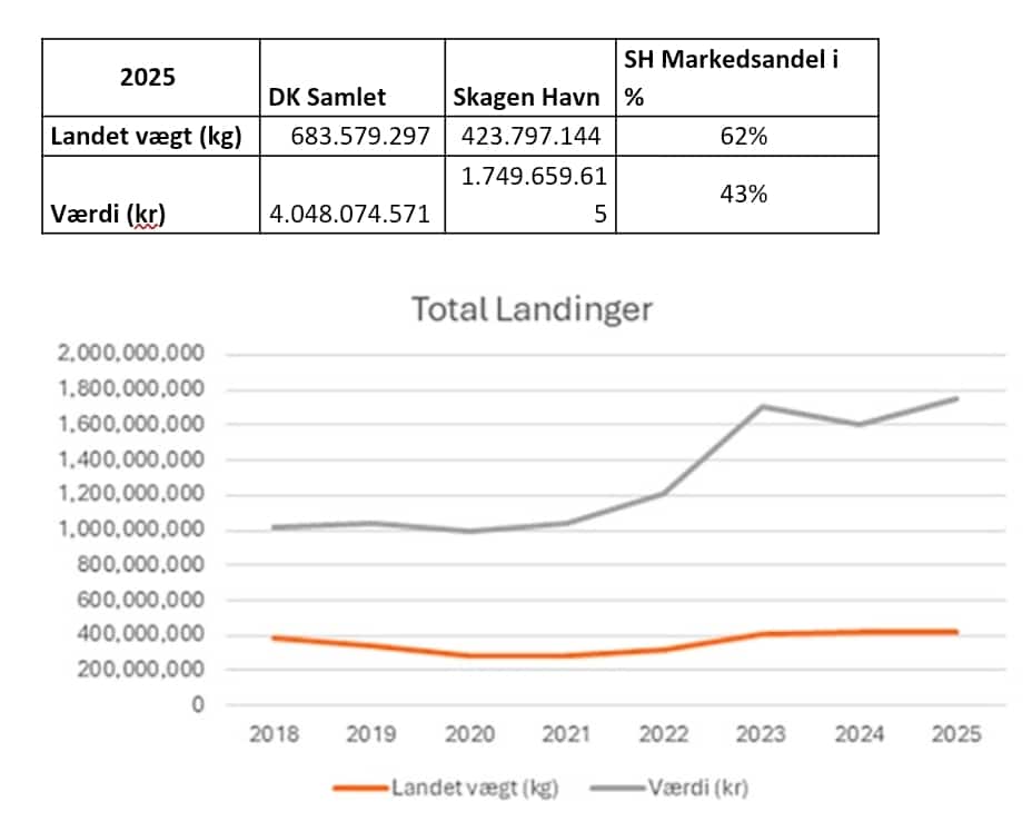 I 2025 har Skagen Havn øget sin markedsandel med yderligere 2 procentpoint. Det betyder, at 62 procent af den samlede mængde landede fisk i Danmark, nu landes i Skagen. Også værdimæssigt har havnen oplevet vækst i 2025, idet andelen af den samlede landingsværdi er steget fra 42 til 43 procent.