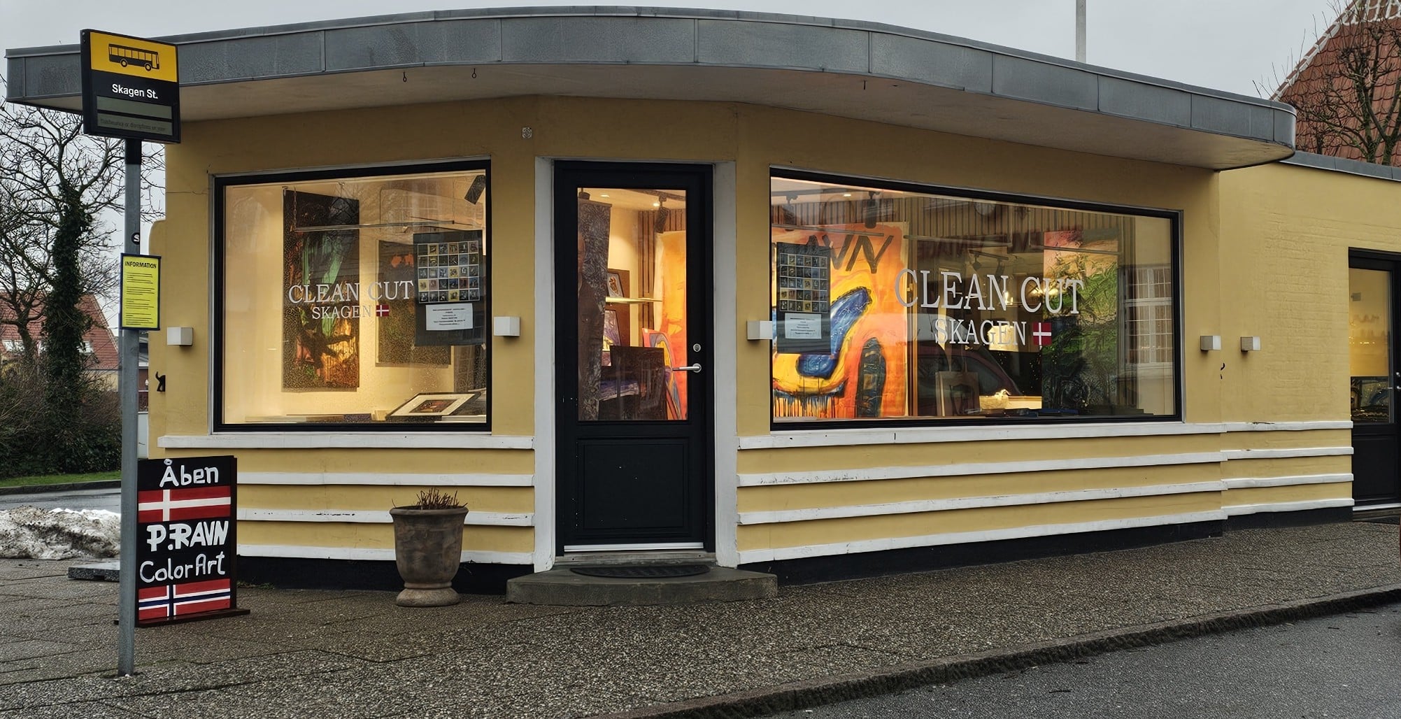Den gule bygning har tidligere huset alt fra tøjbutikker og turistbureau til kaffebar – og senest ejendomsmægleren SkagenBolig. Nu er lokalet i stedet fyldt med farver, penselstrøg og et lille, håndplukket udvalg af Ravns værker – suppleret af nye, smukt dekorerede lertøjsvaser, der giver pop-up galleriet sit helt eget udtryk.