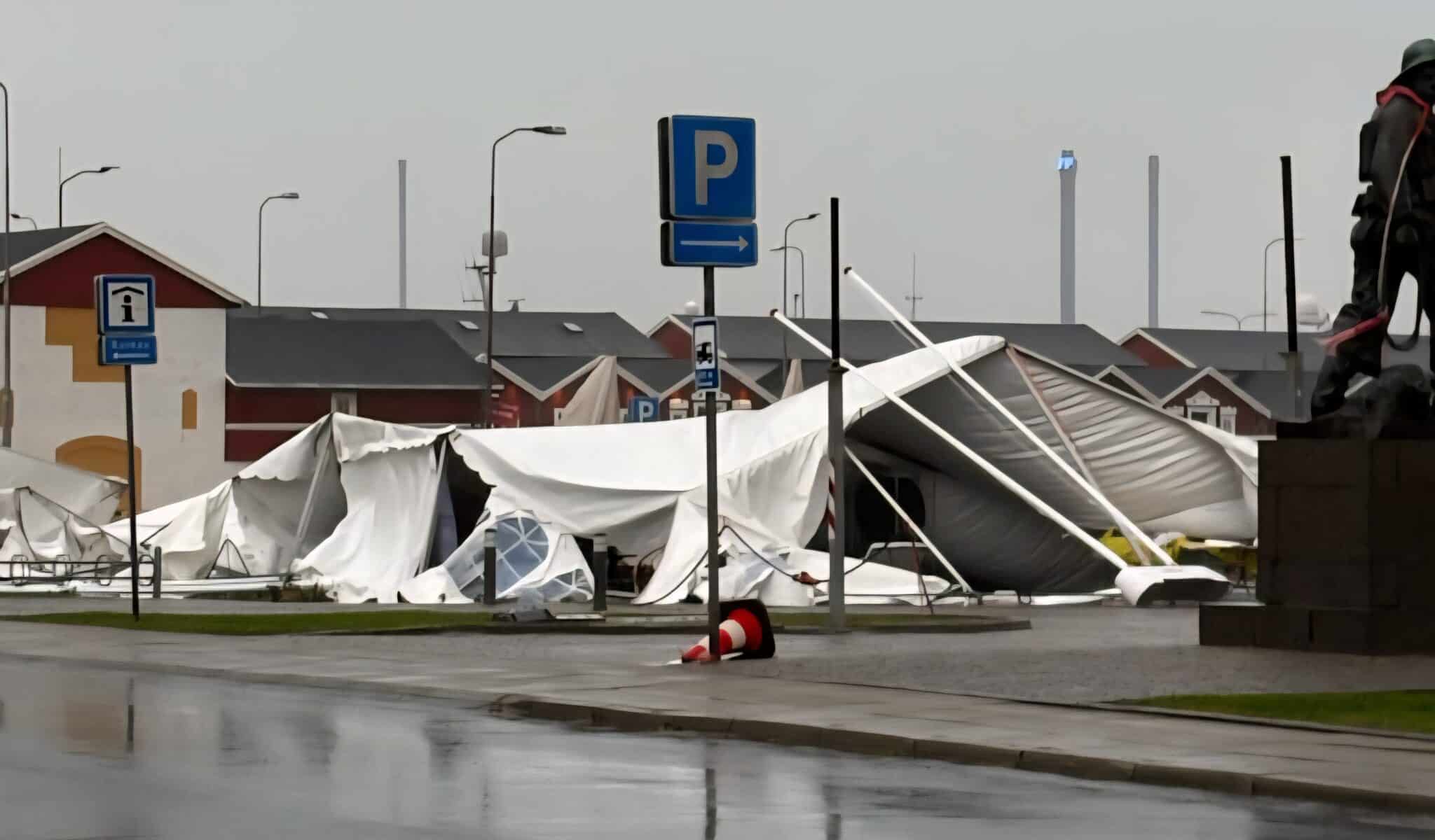 Alt er således kaos og teltet, flagstænger mm. Er væltet ved det der skulle have været start- og målområdet for Skagen Marathon.
