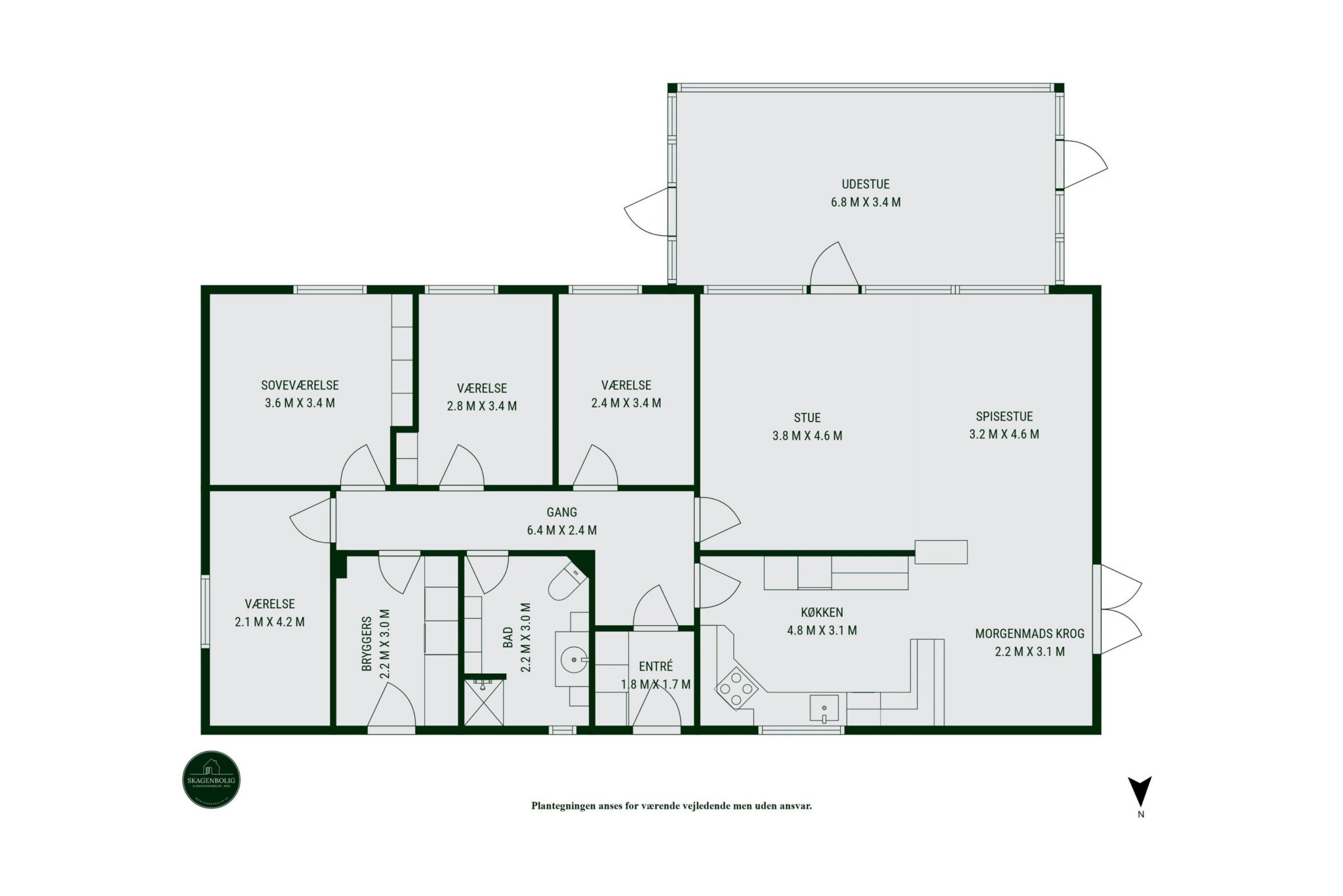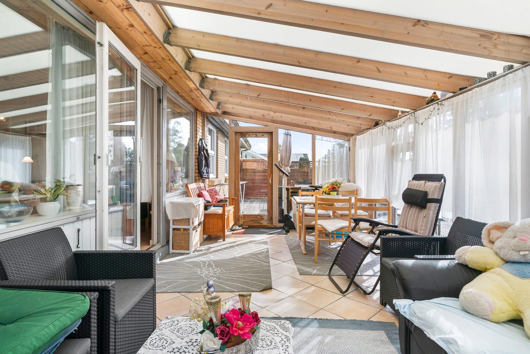 Herfra er der direkte adgang til den rummelige udestue, som forlænger opholdszonen og skaber et naturligt bindeled til haven.