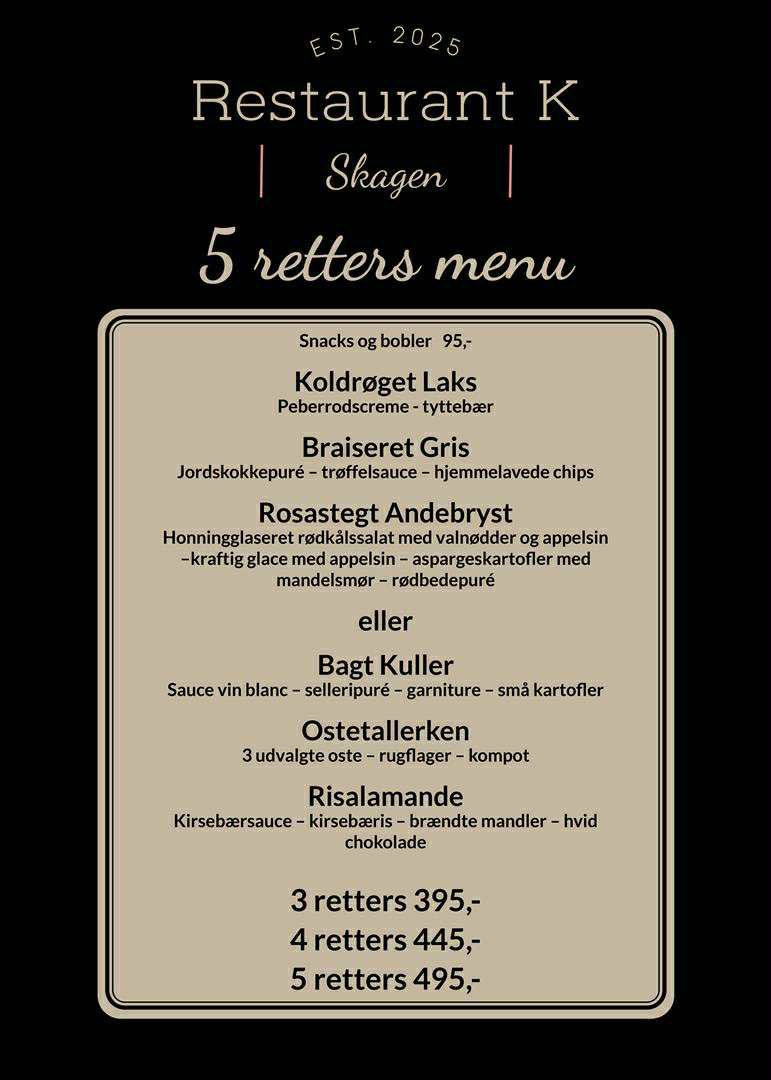 Menukortet kan ses i sin fulde længde på restaurantens hjemmeside, hvor der også kan bookes bord: www.restaurantk.dk