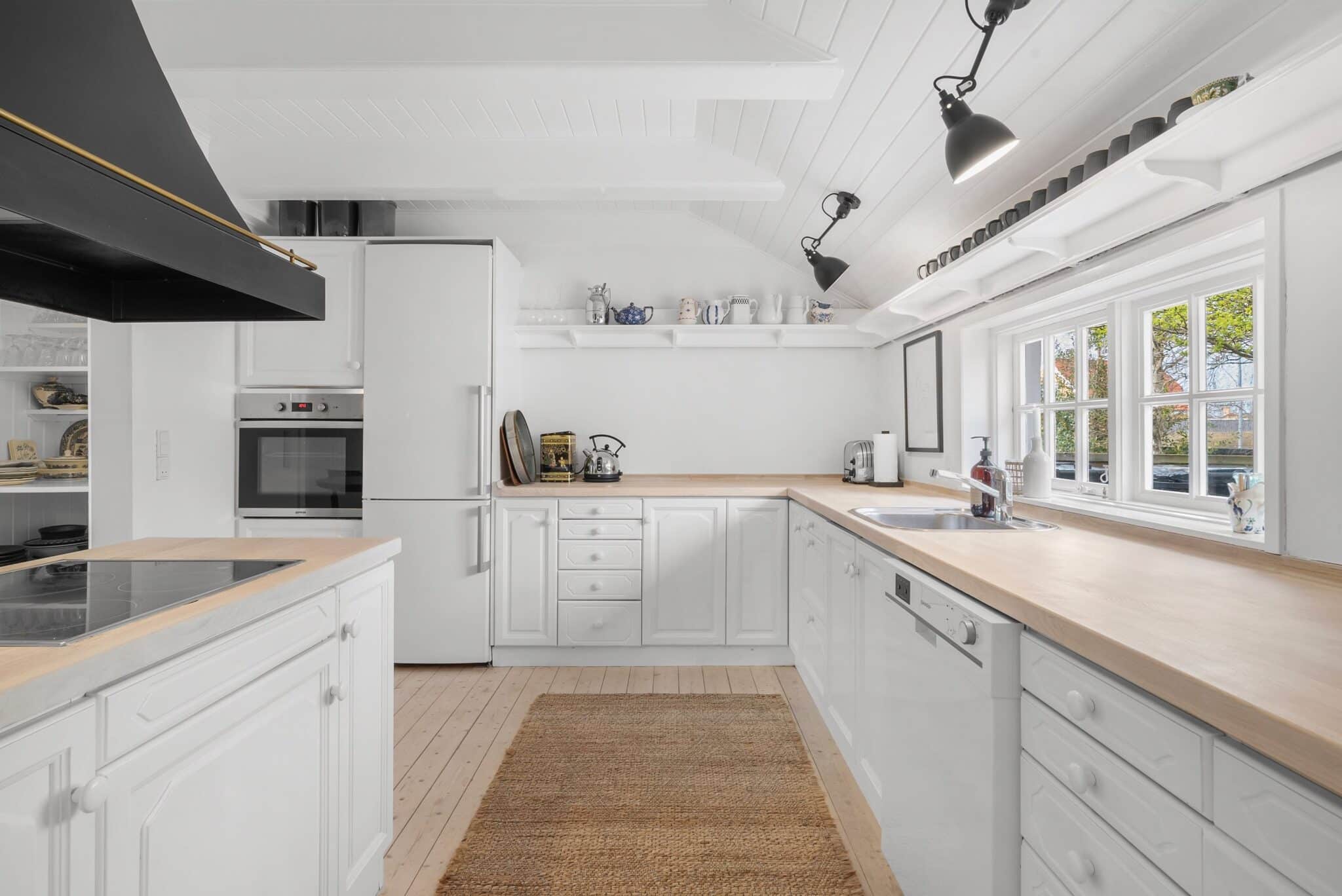 Køkkenet er udstyret med kogeø, frithængende smedejernsemhætte, indbygget ovn, køle-/fryseskab samt mulighed for spiseplads. Den rummelige stue har plads til flere siddeområder og rummer en sjælden, smuk pejs bygget i pigsten fra stranden. Herfra er der udgang gennem to dobbelte terrassedøre til den frodige have. Stuen har et flot, oprindeligt trægulv og et smukt bjælkeloft.