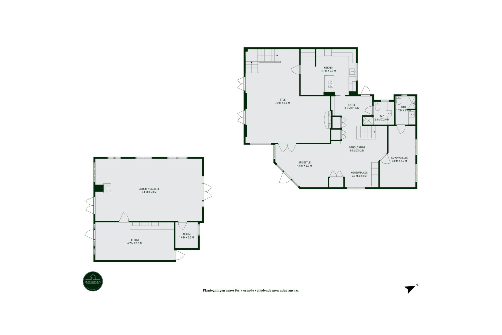 Villaen rummer 209 m² boligareal fordelt på 131 m² i stueetagen og 78 m² på første sal. Grunden er på 853 m². Derudover er der en ekstra bygning på 86 m² i samme stil som hovedhuset. I dag benyttes den til kreative aktiviteter, men den kan nemt indrettes som anneks. I forlængelse af bygningen findes et mindre viktualierum og et værksted med tørrerum m.m. Bagerst i haven er der et udhus i træ – og et charmerende lysthus opført af gamle vinduer fra Jeckels Hotel i Gl. Skagen. Man bydes velkommen i en entré med Trip Trap trægulv og en række indbyggede skabe, produceret på det tidligere Skagen Yachtværft. I et af skabene er der installeret vaskemaskine og tørretumbler. Badeværelset er med bruseniche, gulvvarme og håndklædevarmer.