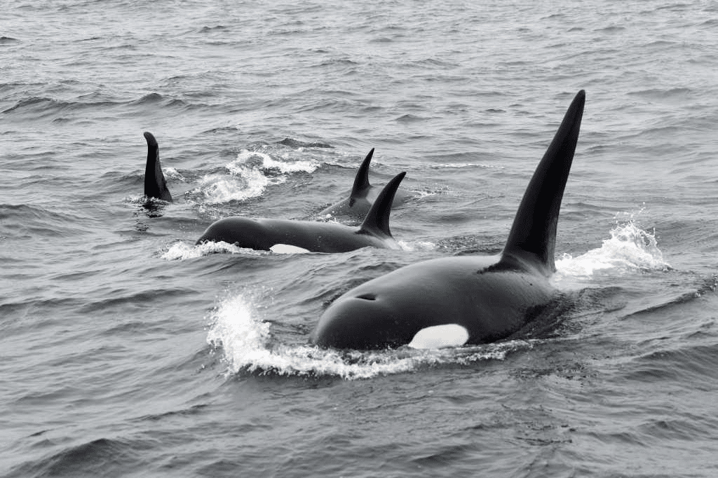 Spækhuggerne jager fisk mellem mange stormmåger og rider.