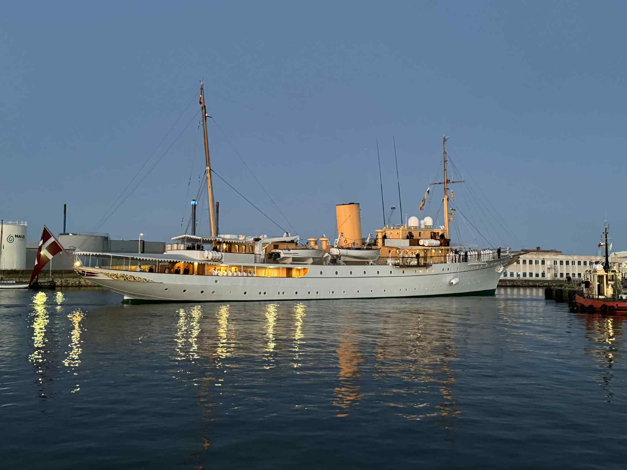 Nu går turen tilbage til Kongeskibet Dannebrog som lagde til kaj ved Paketvej bag ved Skagen Fiskerestaurant kort før kl. 14 her til eftermiddag, forud for aftenens reception, hvor gæsterne ankommer fra kl. 18.30.