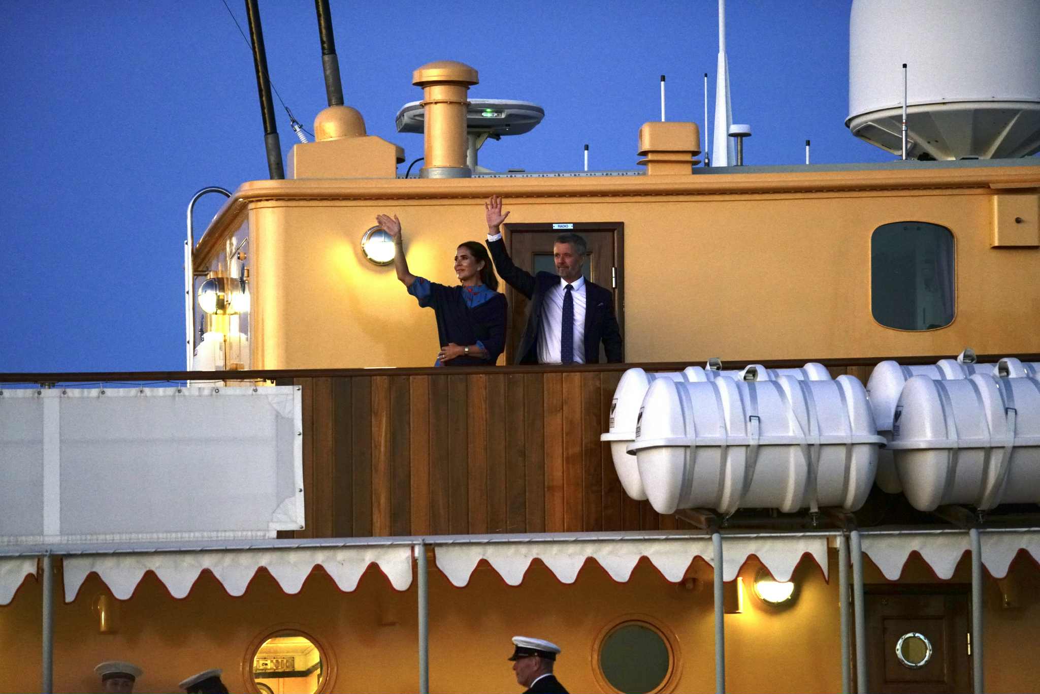 Kongeparret har nu æren af at byde ca. 90 gæster velkommen til reception på Kongeskibet Dannebrog.