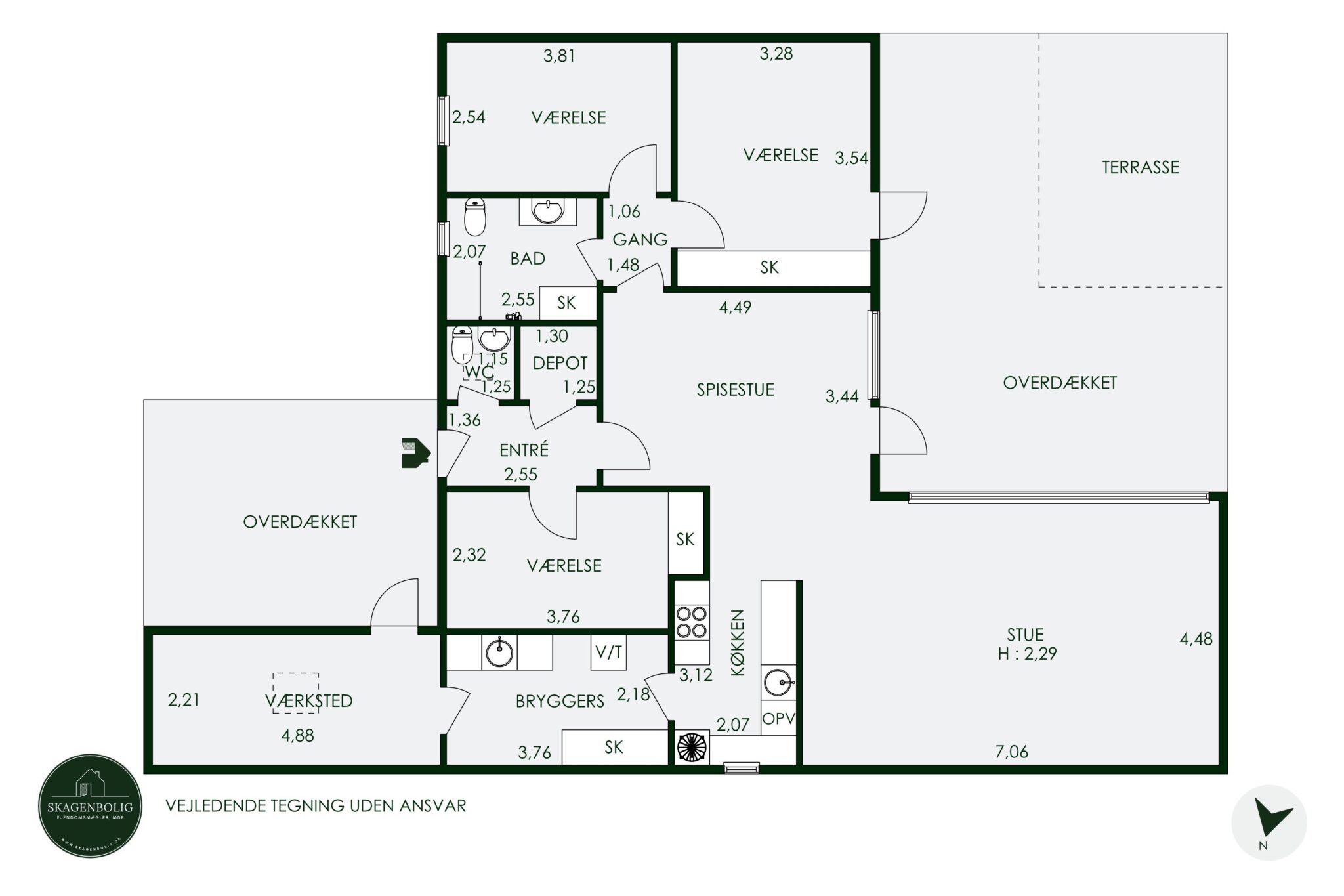 Huset rummer også et bryggers med adgang til værksted og depotrum, som giver ekstra opbevaringsplads og gode muligheder for hobby og praktiske formål.